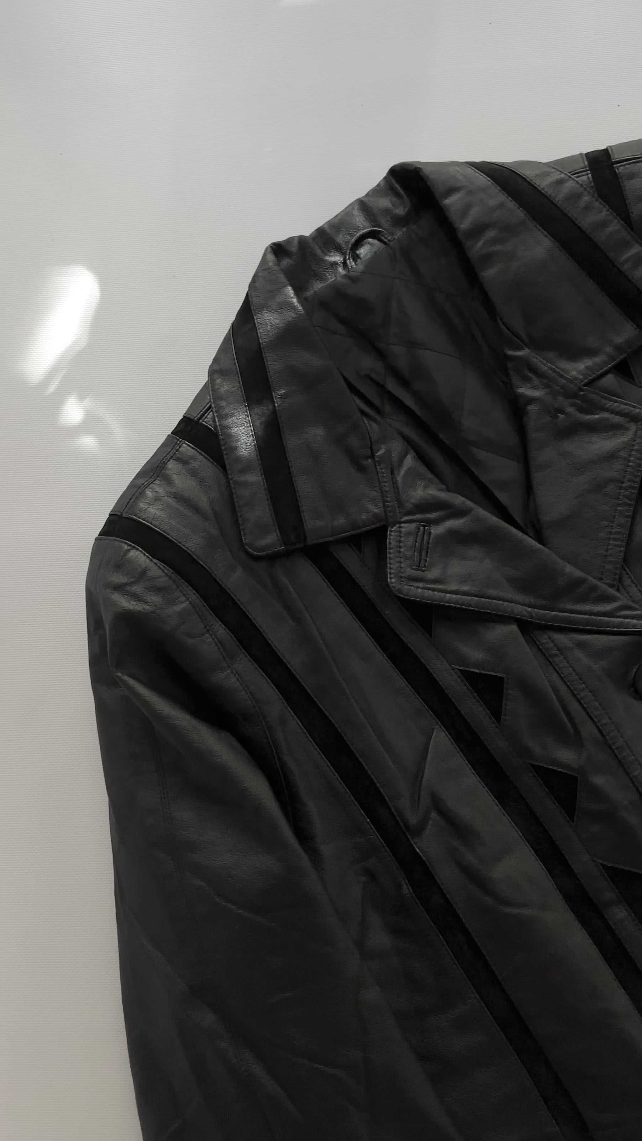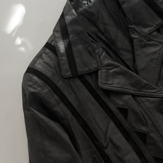 Vintage late 1980s black leather jacket with distinctive geometric appliqué detailing and a sculptural silhouette. Crafted in supple leather, it features a wide notched collar, structured shoulders, and tab cuffs. The front and pockets are accented with tonal suede in angular motifs. Fully lined for comfort, with a relaxed fit and mid-length cut.