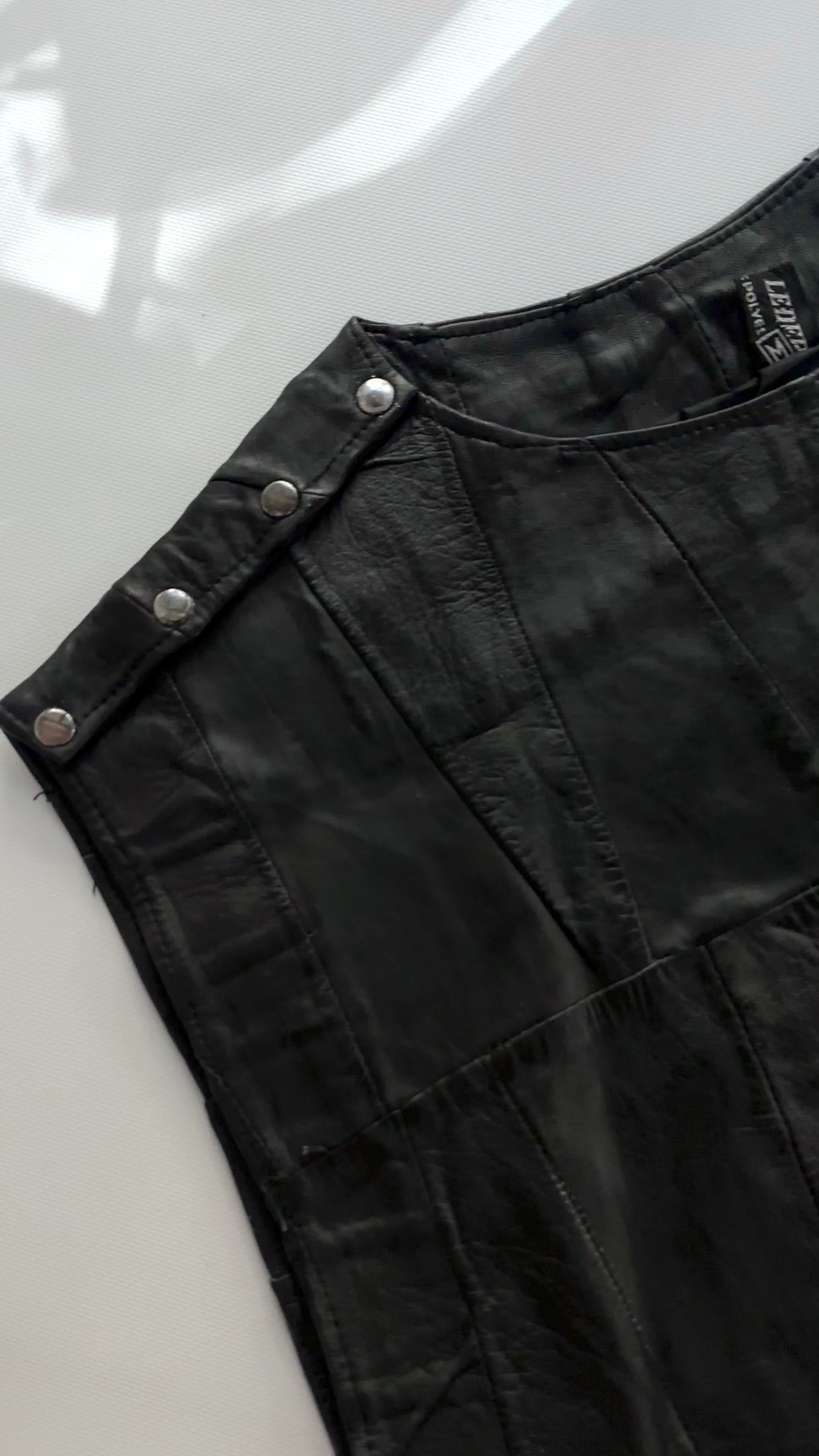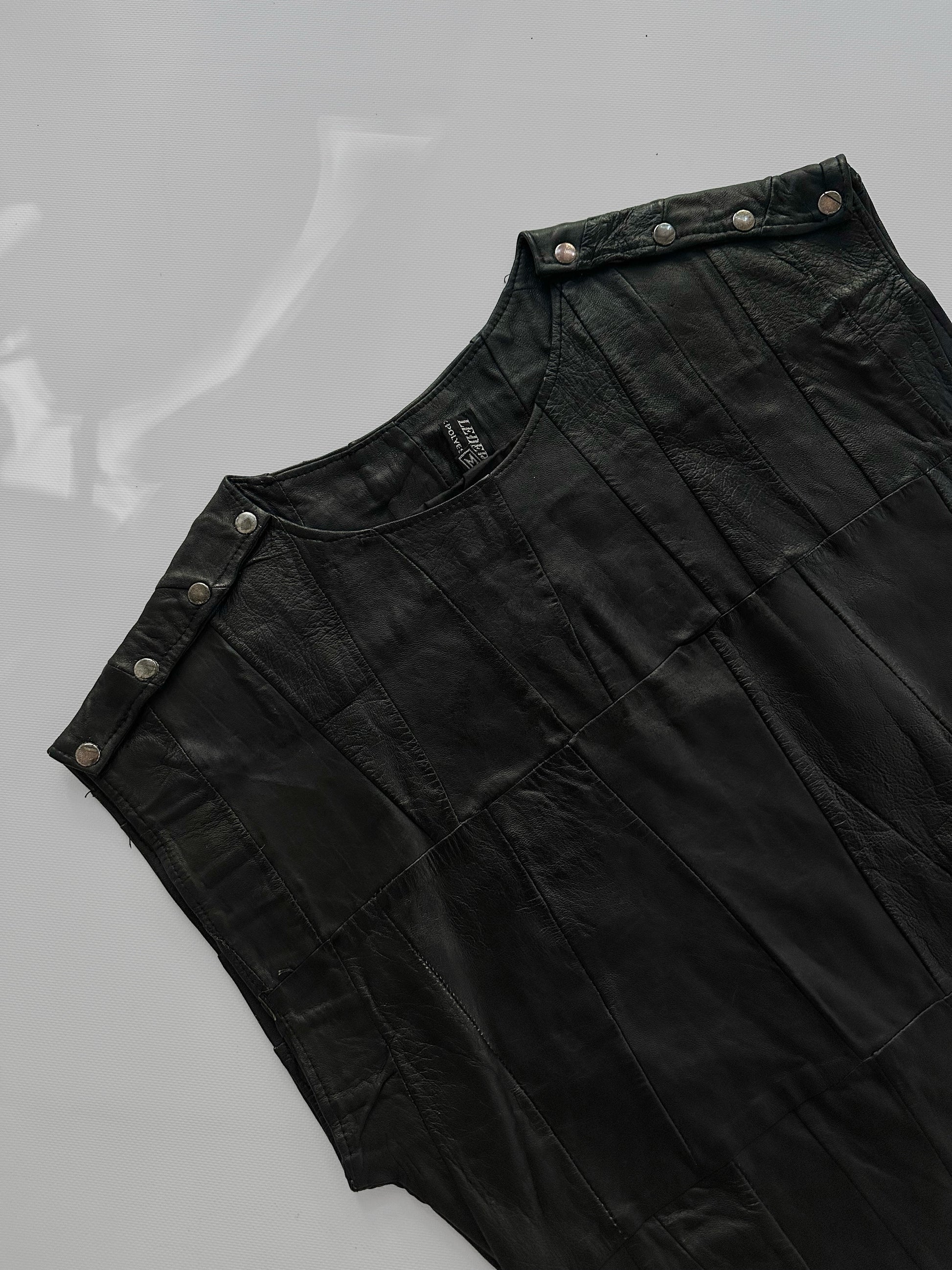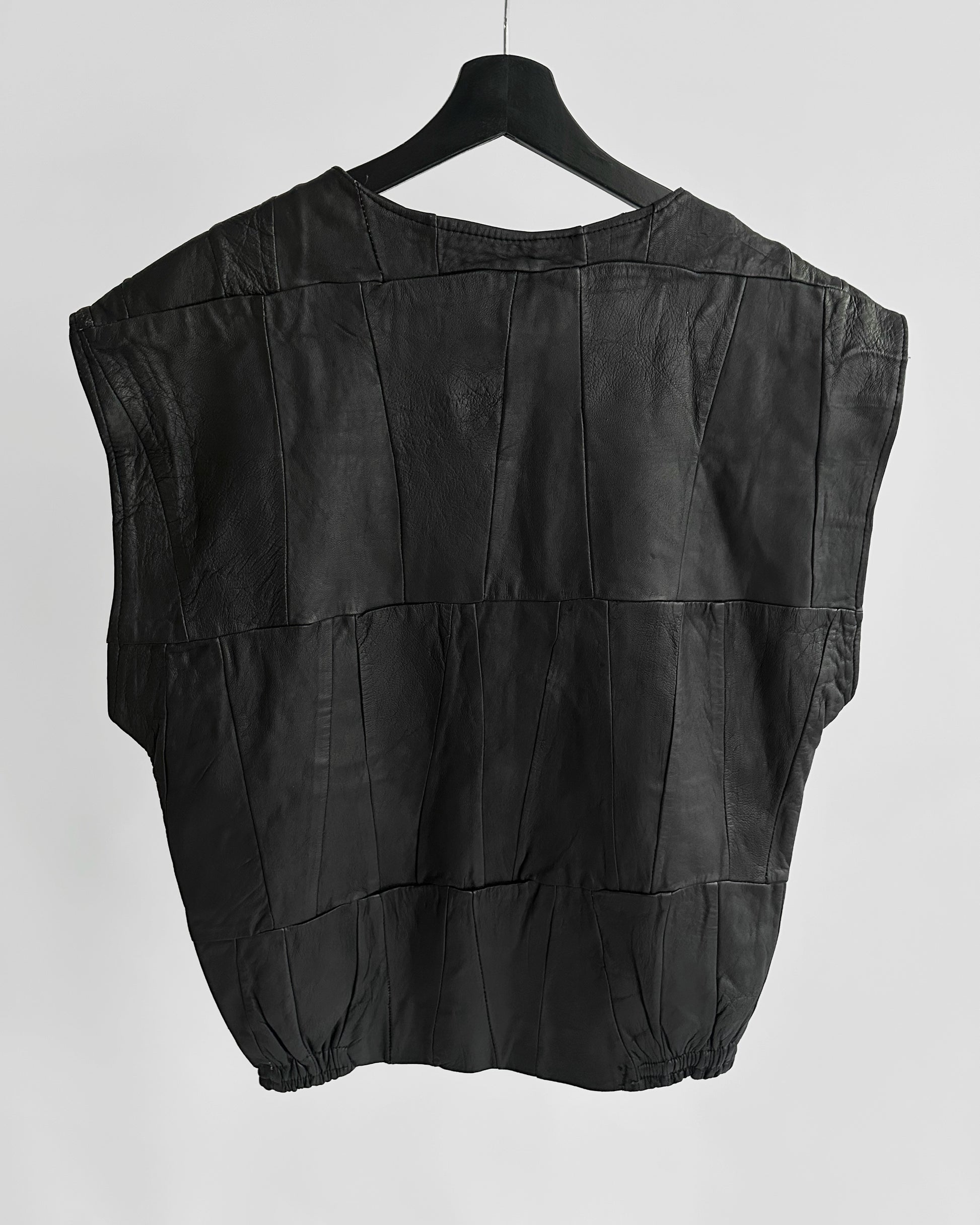 Vintage 1980s black patchwork leather waistcoat with a structured wide-shoulder silhouette. Designed with metal snap-button detailing along the shoulders, a round neckline, and an elasticated hem for subtle shape. Constructed from supple leather panels in a tonal patchwork design, fully lined for comfort and structure.