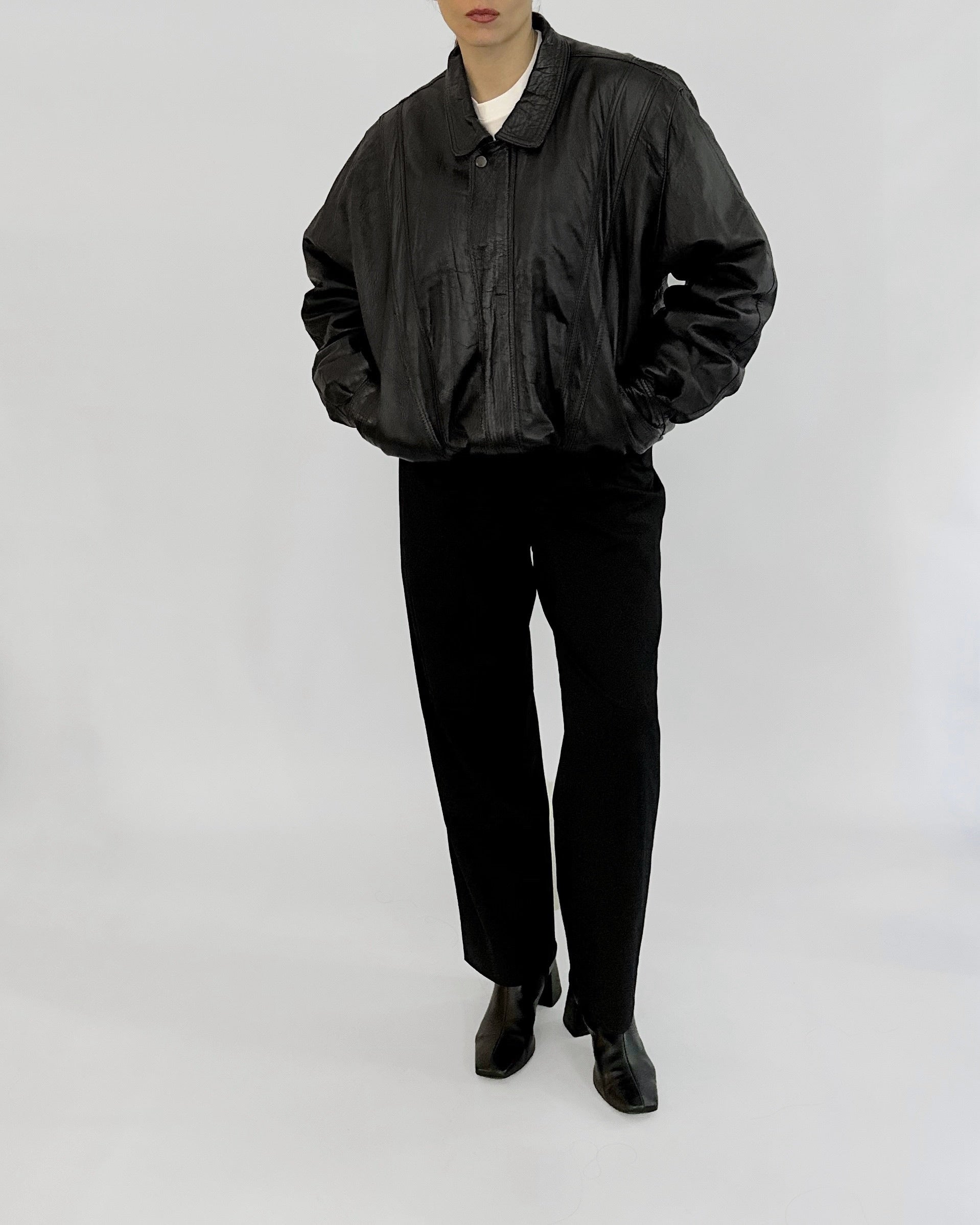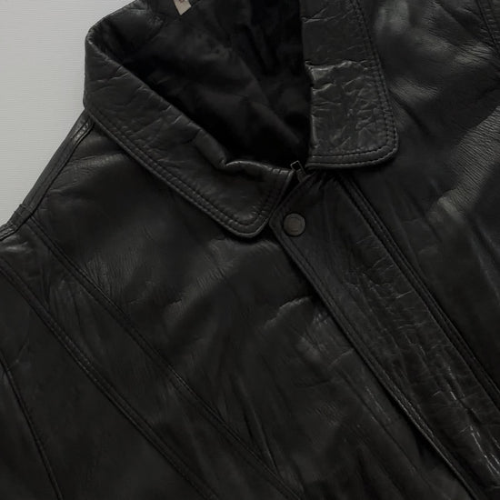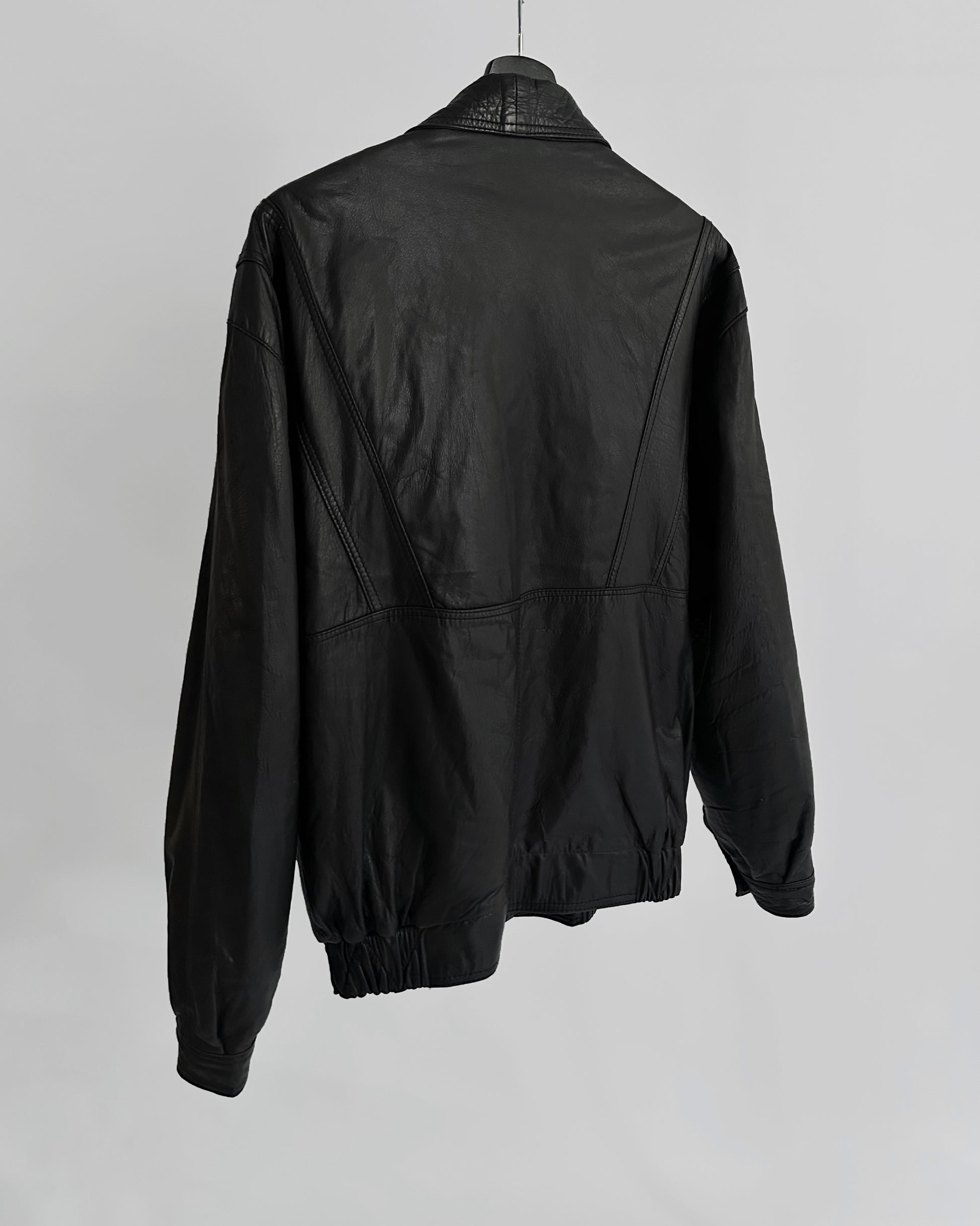 Vintage 1980s black leather bomber jacket. Crafted from soft leather, it features a classic zip front, pointed collar, and two side slit pockets. Designed with a relaxed cut and elastic hem for a comfortable fit. Fully lined for structure and ease.