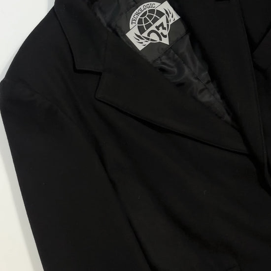 Vintage 1980s black wool-blend overcoat with a clean, straight silhouette and classic tailoring. Made in Spain, it features notch lapels, a two-button front, and lightly structured shoulders. Fully lined for comfort, with flap pockets and a rear vent for ease of movement. A timeless everyday coat with a refined, minimalist look.