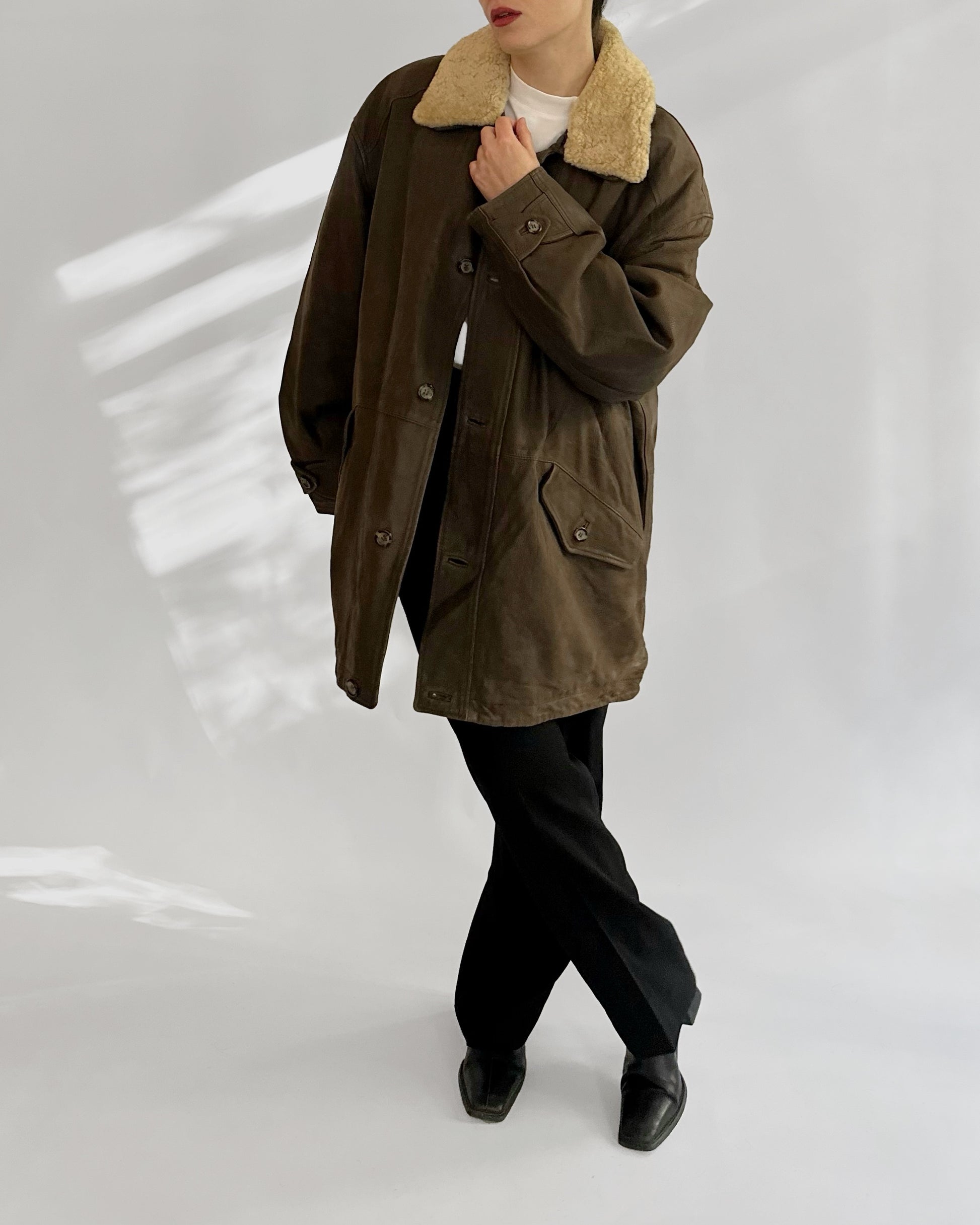 Vintage 1980s brown leather coat with a clean, straight silhouette and a rugged, utilitarian feel. Crafted in genuine leather, it features a detachable faux shearling collar and a button-front closure. Fully lined for warmth, with two front flap pockets and adjustable button tabs at the cuffs. A timeless outerwear piece designed for easy layering.