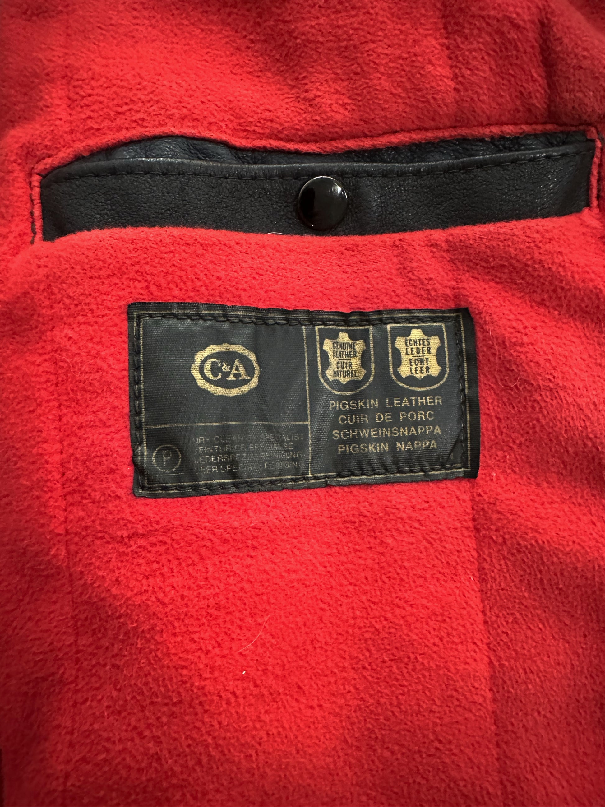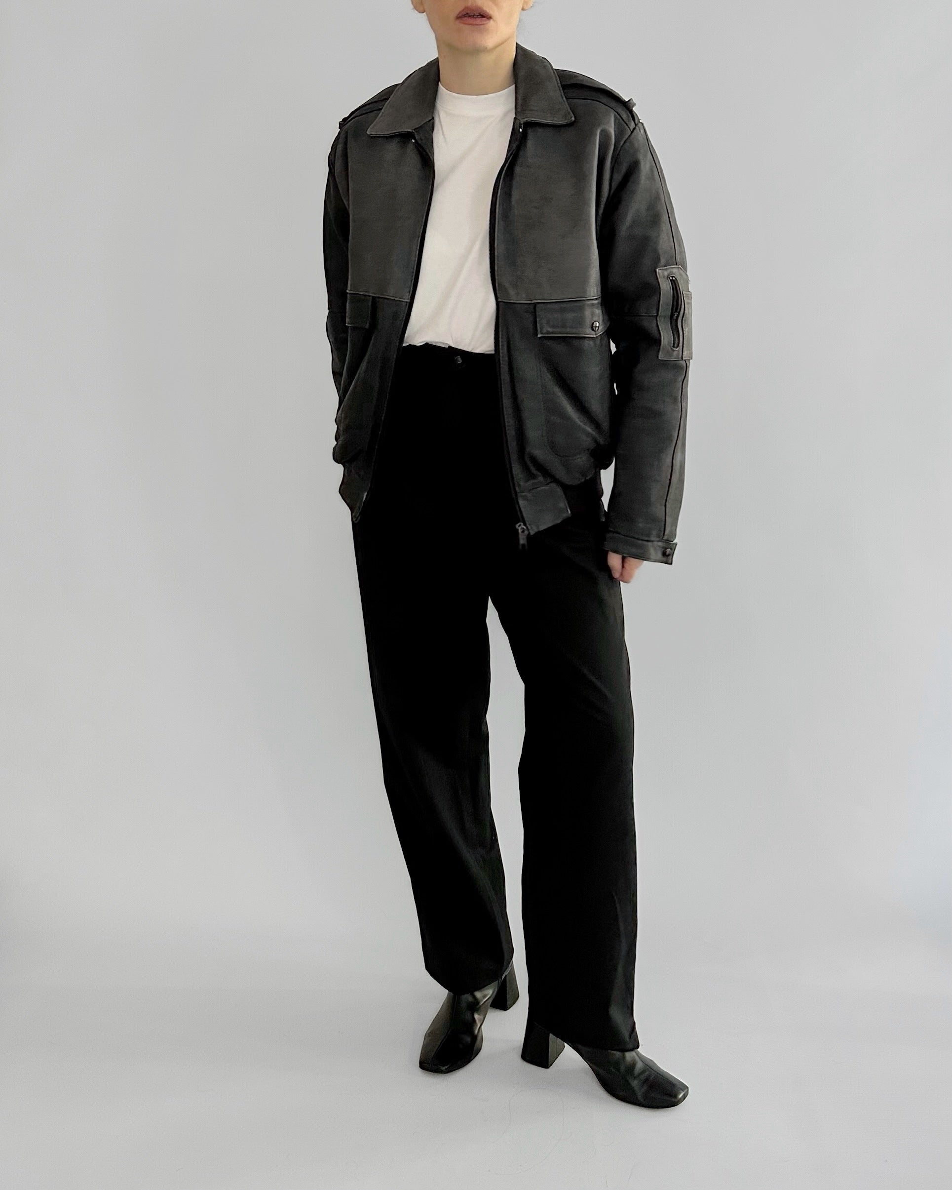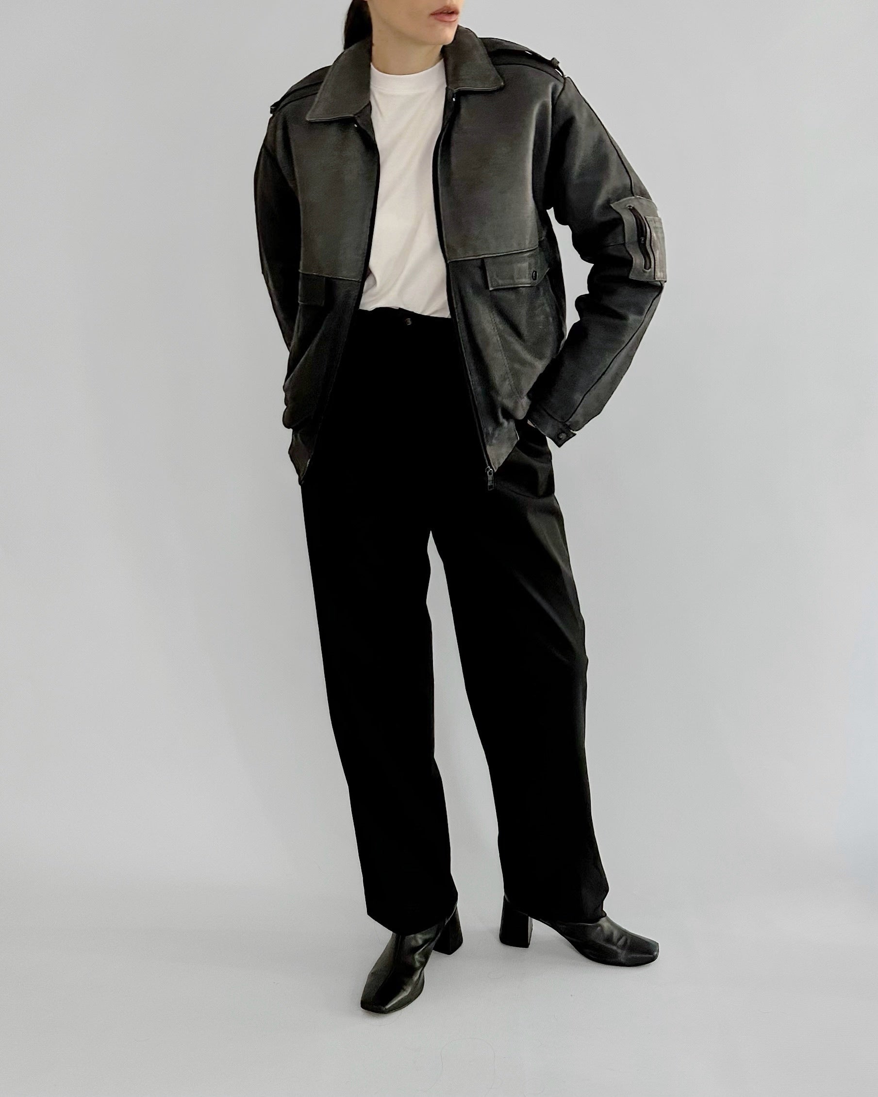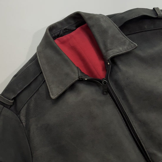 Vintage 1980s genuine leather bomber jacket with a rugged, lightly distressed finish and structured silhouette. Designed with a pointed collar, front zip closure, and two large flap pockets, it features epaulettes, an arm utility pocket, and adjustable tabs at the cuffs and hem. Finished with ribbed knit trim and a bold red lining for contrast. A classic vintage bomber with timeless character.