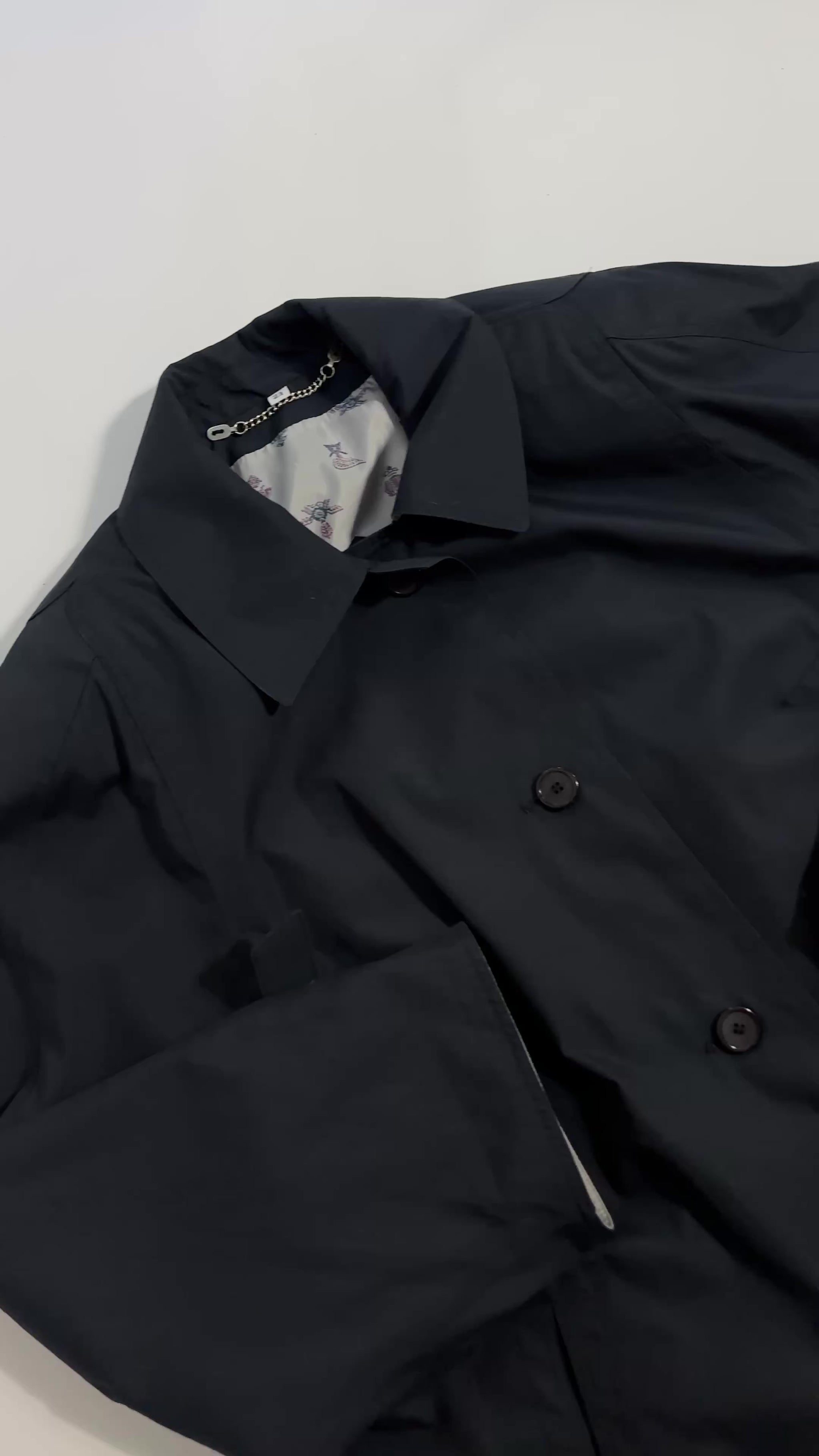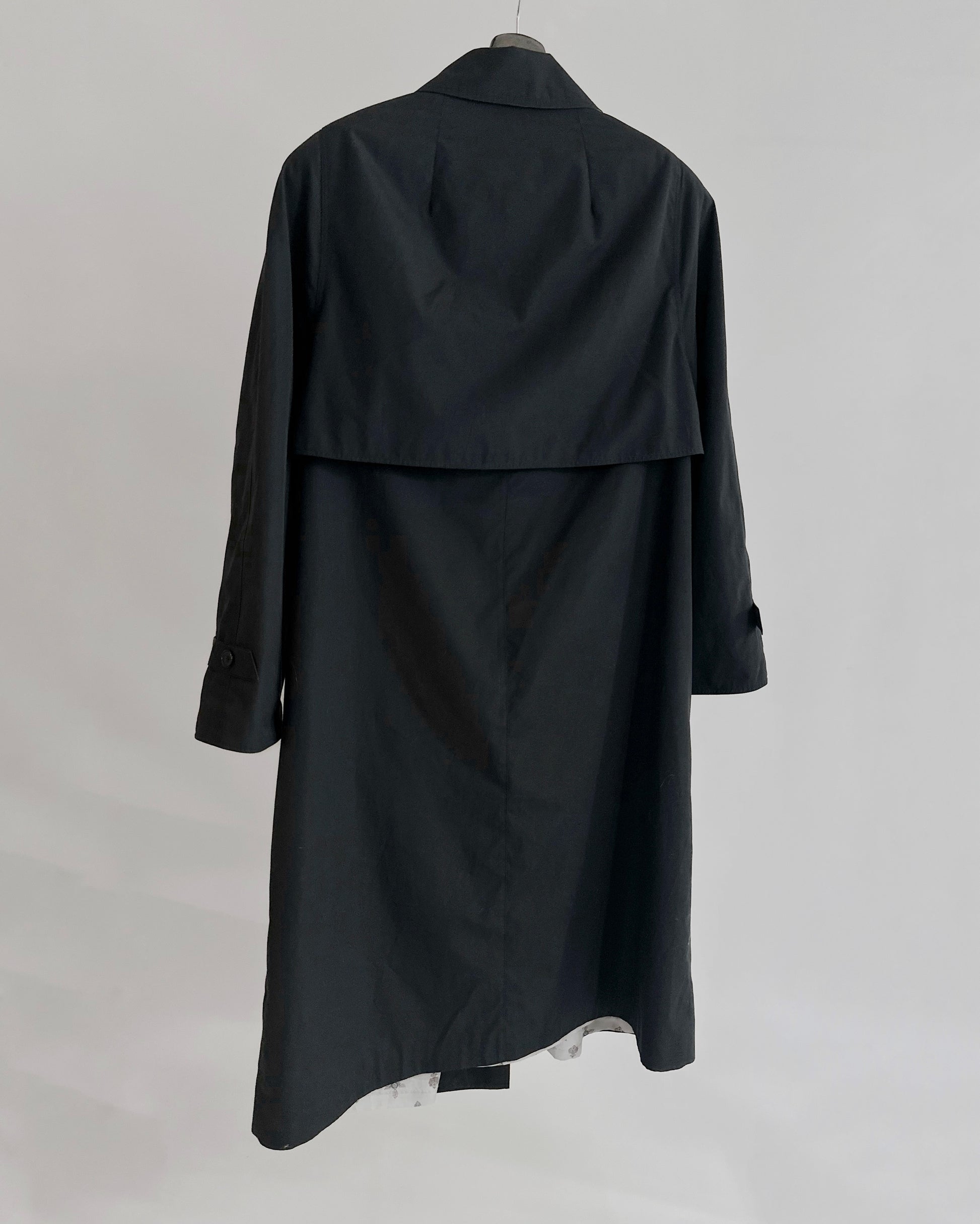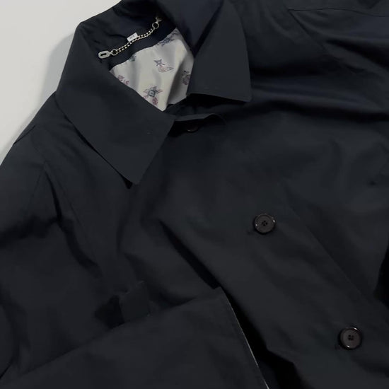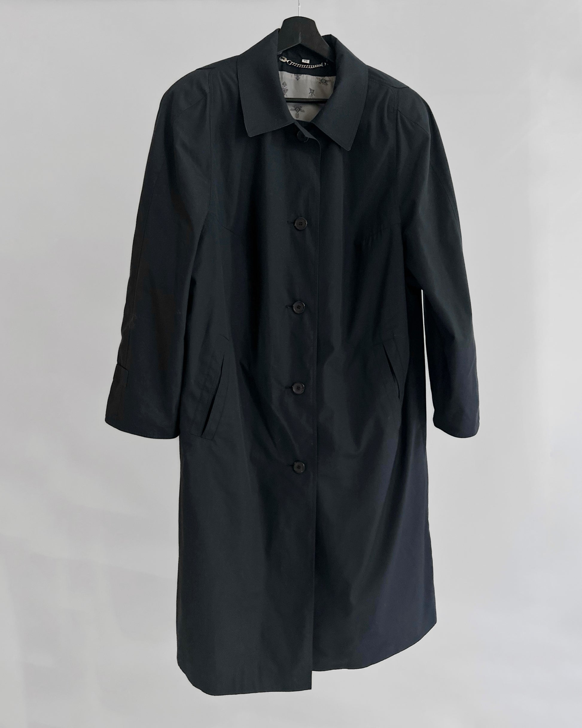Vintage 1980s dark navy trench coat with a clean long-length silhouette and minimalist design. Cut in a single-breasted style, it features a pointed collar, button front, padded shoulders and angled welt pockets. Fully lined for structure and comfort, this timeless coat is perfect for effortless layering.