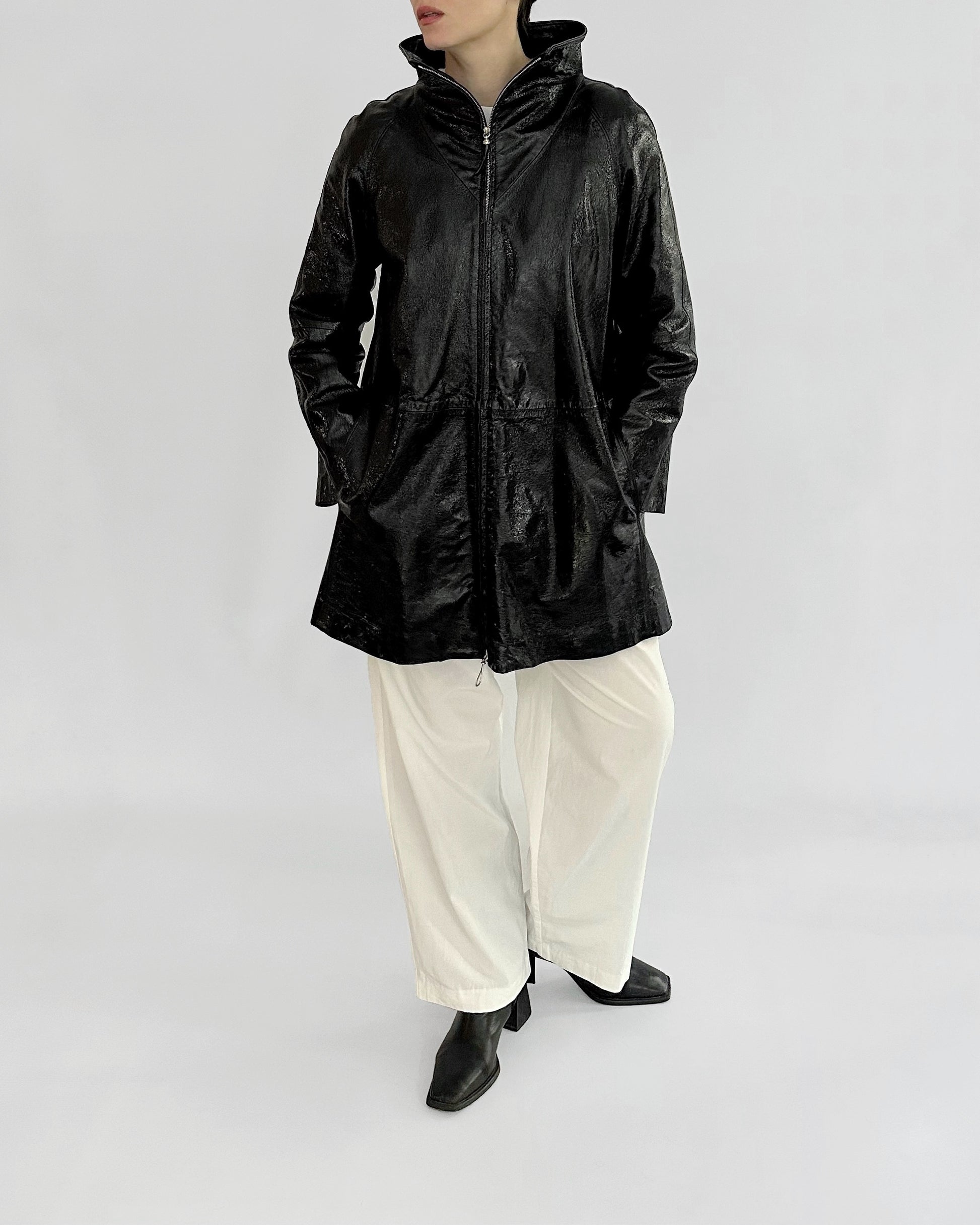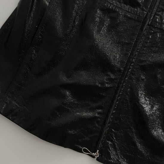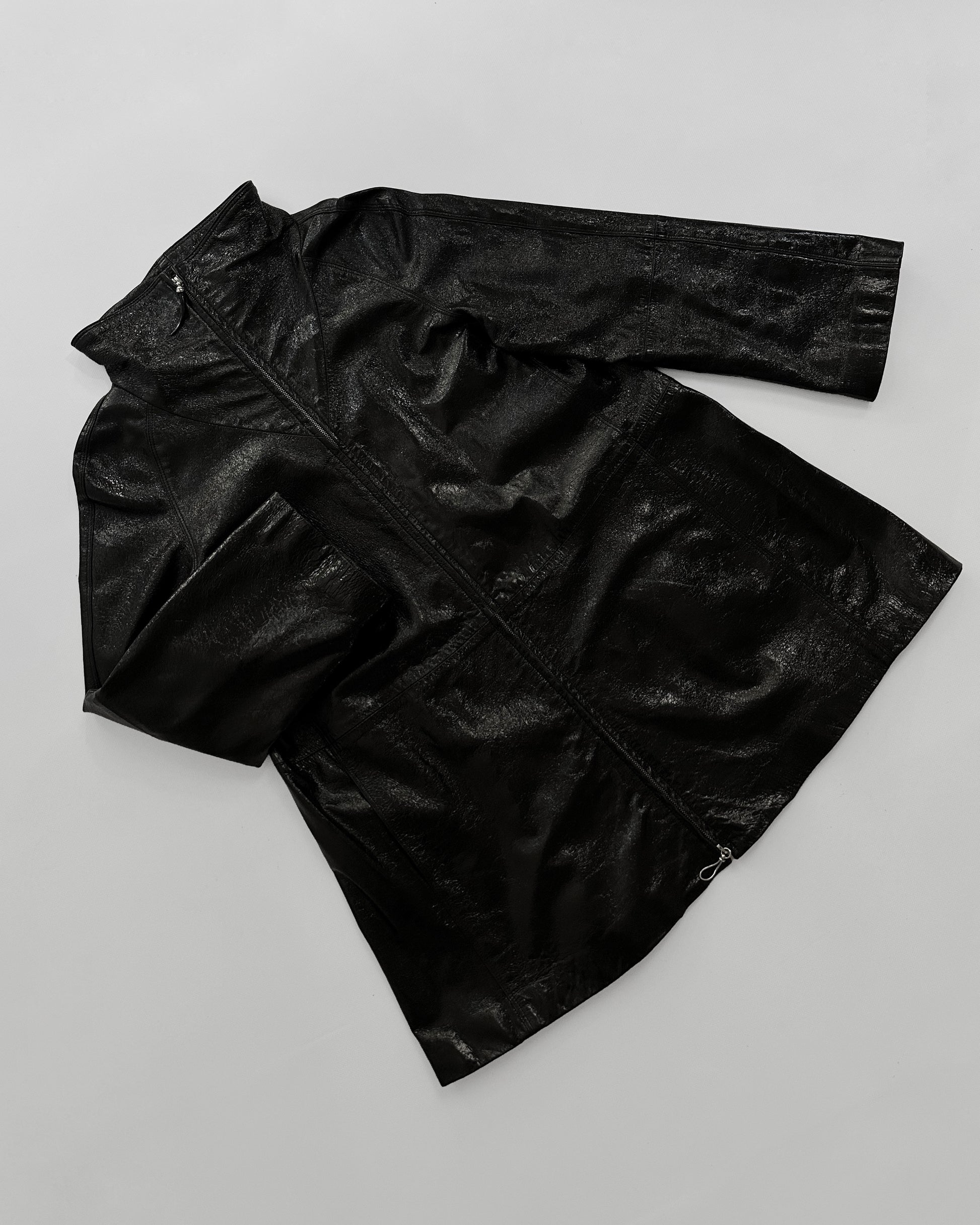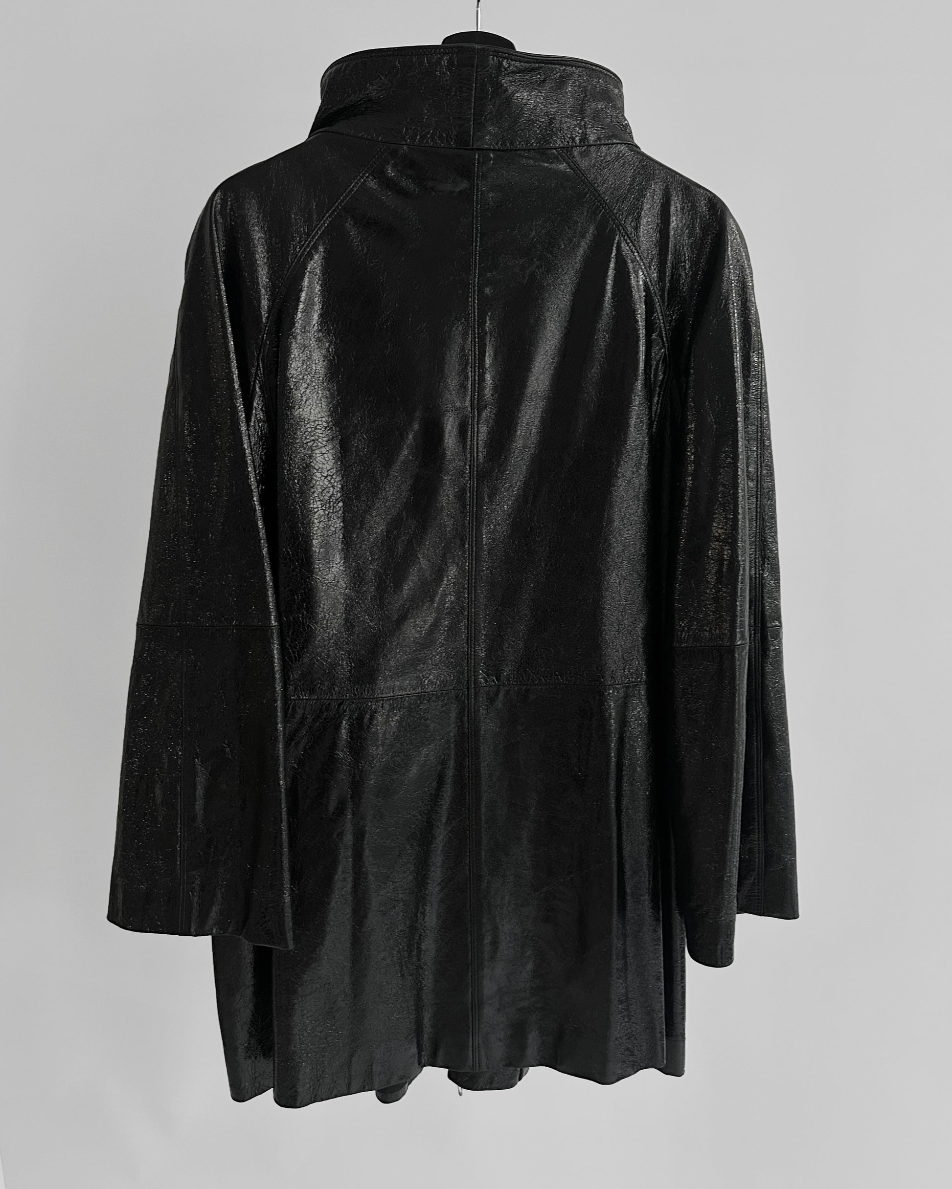 Vintage 1980s Gianfranco Ferré black patent leather coat with an architectural, minimalist silhouette. Made in Italy, it features a high funnel collar, double zipper closure, and a clean panelled design. Fully lined for structure and comfort. A rare example of Ferré’s sculptural approach to outerwear.