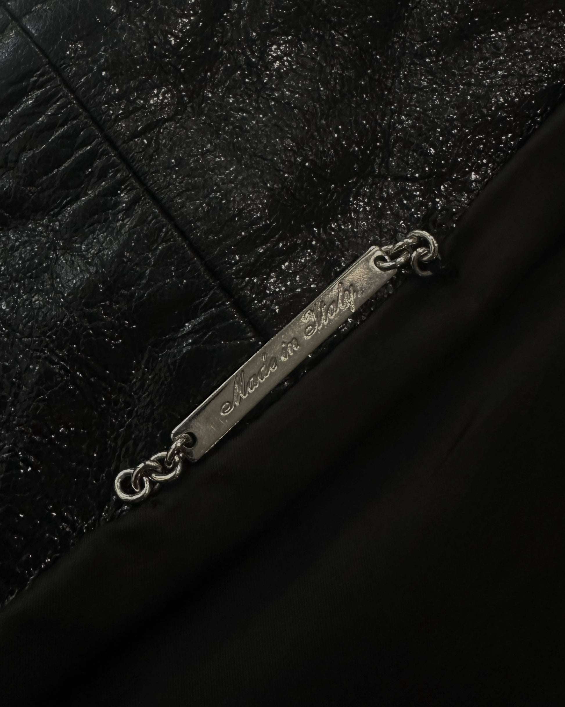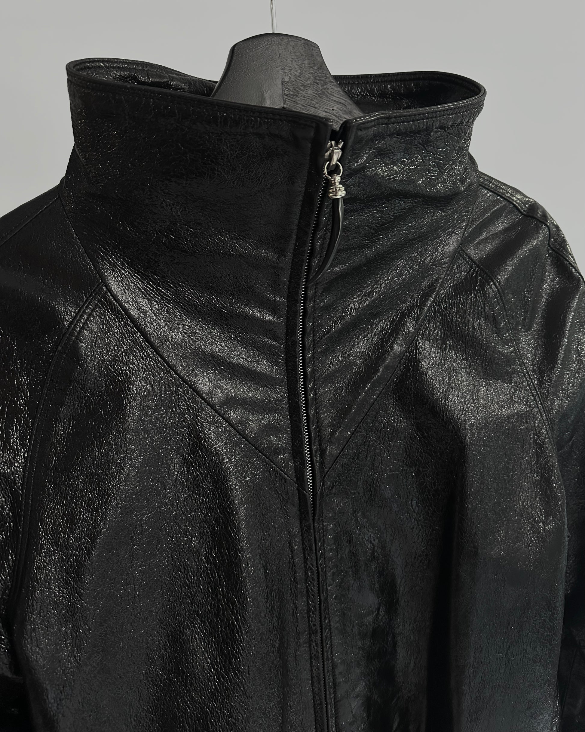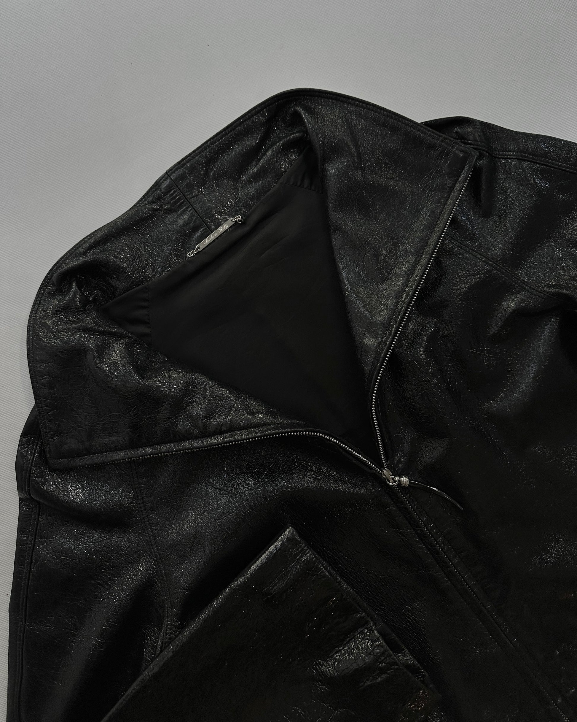 Vintage 1980s Gianfranco Ferré black patent leather coat with an architectural, minimalist silhouette. Made in Italy, it features a high funnel collar, double zipper closure, and a clean panelled design. Fully lined for structure and comfort. A rare example of Ferré’s sculptural approach to outerwear.