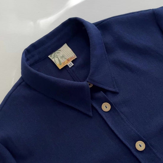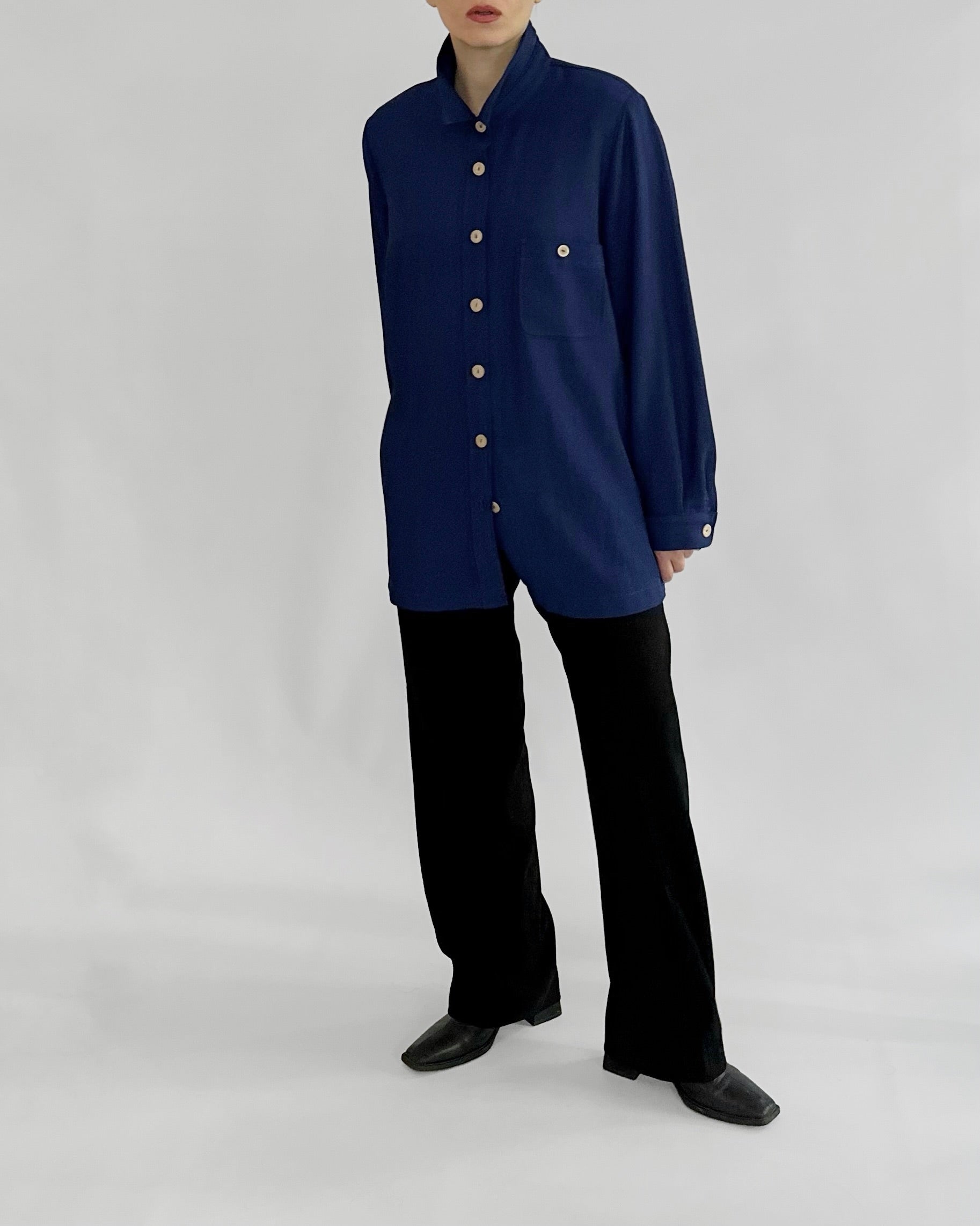 Vintage 1980s royal blue shirt with a relaxed, fluid silhouette and adjustable tie detail at the back. Crafted from a lightweight semi-sheer fabric, it features a pointed collar, buttoned cuffs, and a single chest pocket. The natural tone buttons add a soft contrast to the deep navy hue.