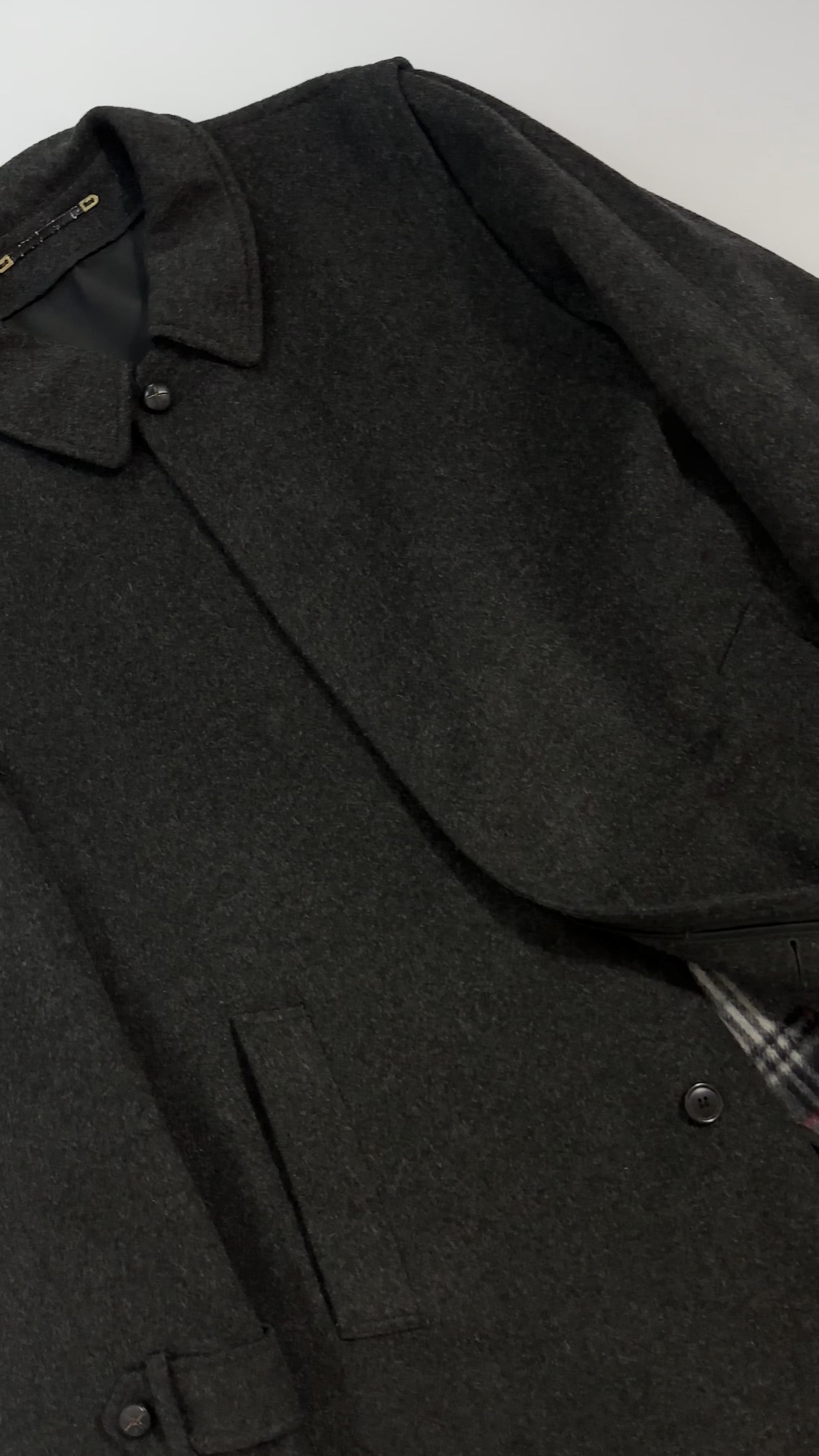 Designed with a clean straight silhouette, it features a pointed collar, raglan sleeves, and tab-button cuffs. Fully lined with a warm plaid interior and finished with a concealed button front. A timeless outerwear piece, ideal for effortless layering.