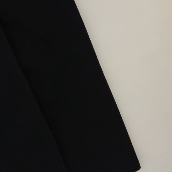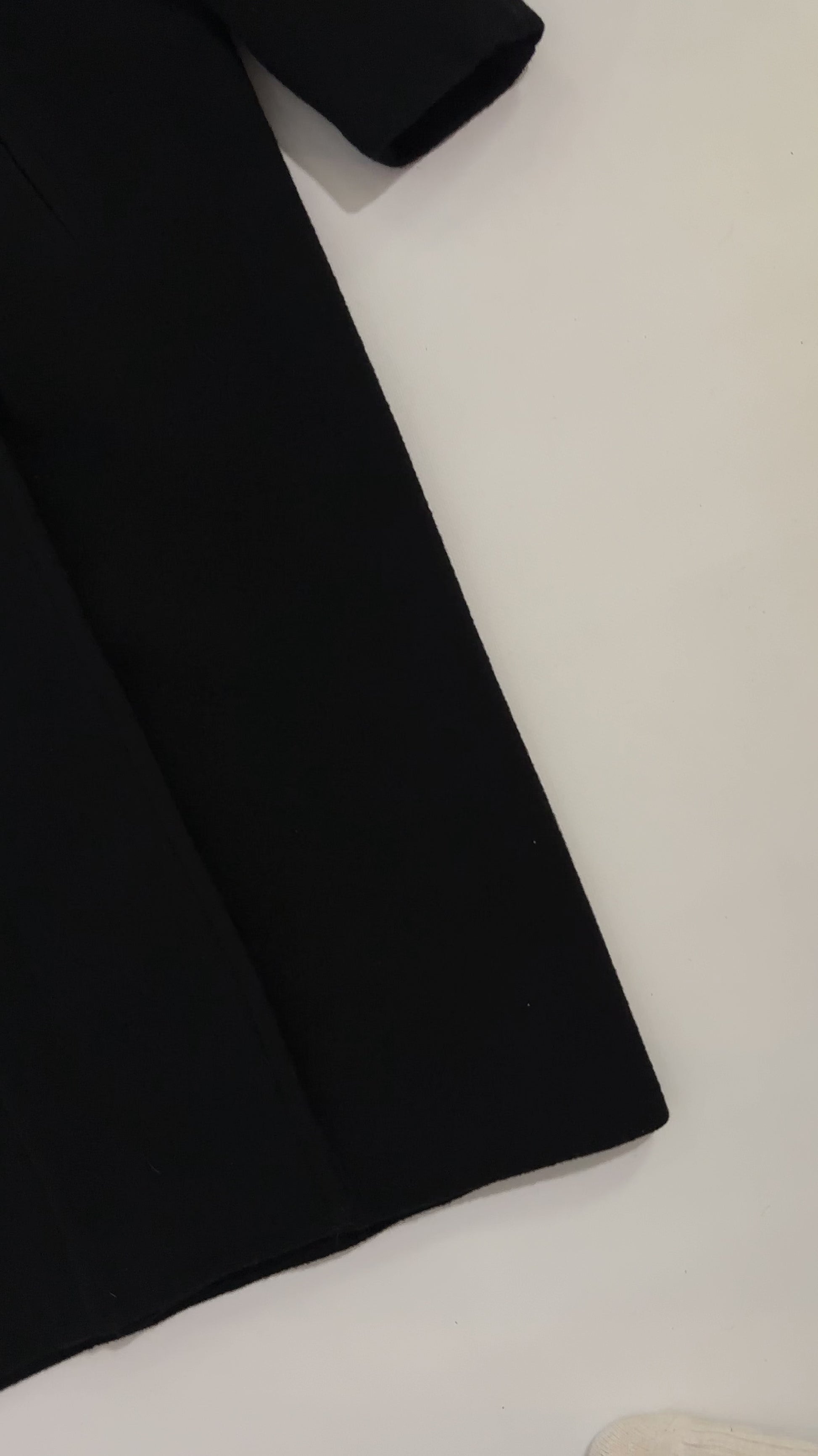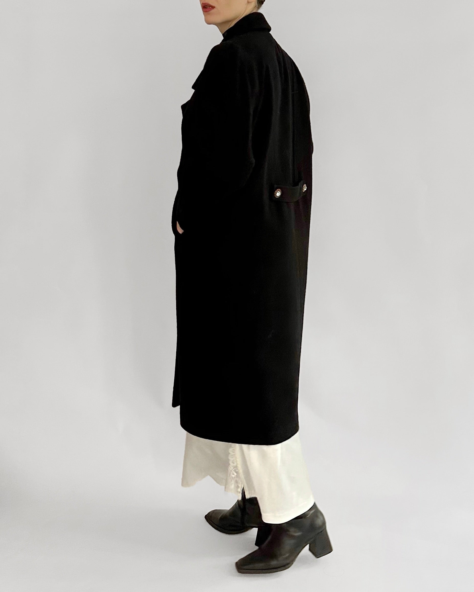 Vintage 1990s black wool-blend coat with a long, tailored silhouette and structured shoulders. It features a double-breasted front, peak lapels, and ornate jewel-style buttons. Fully lined for comfort, with two front welt pockets for practicality. A refined and timeless piece, ideal for elegant winter layering.