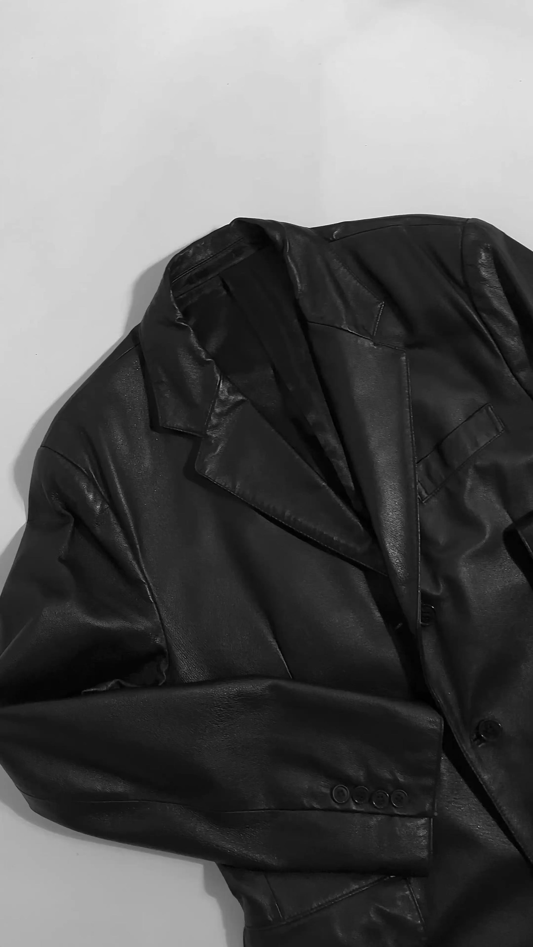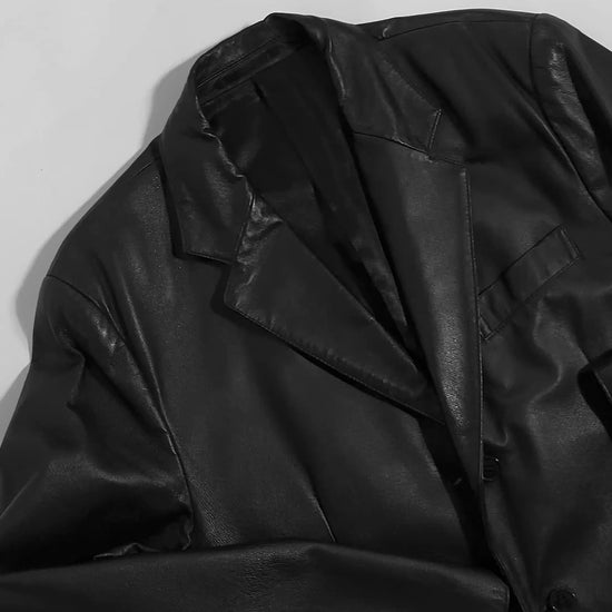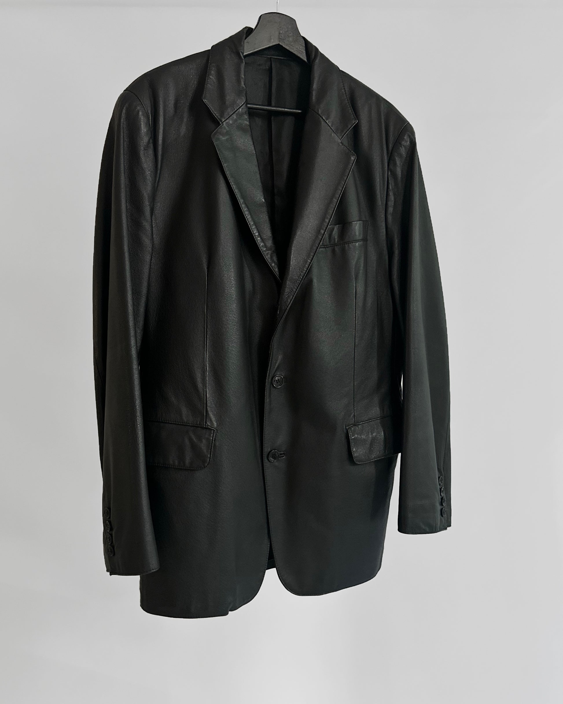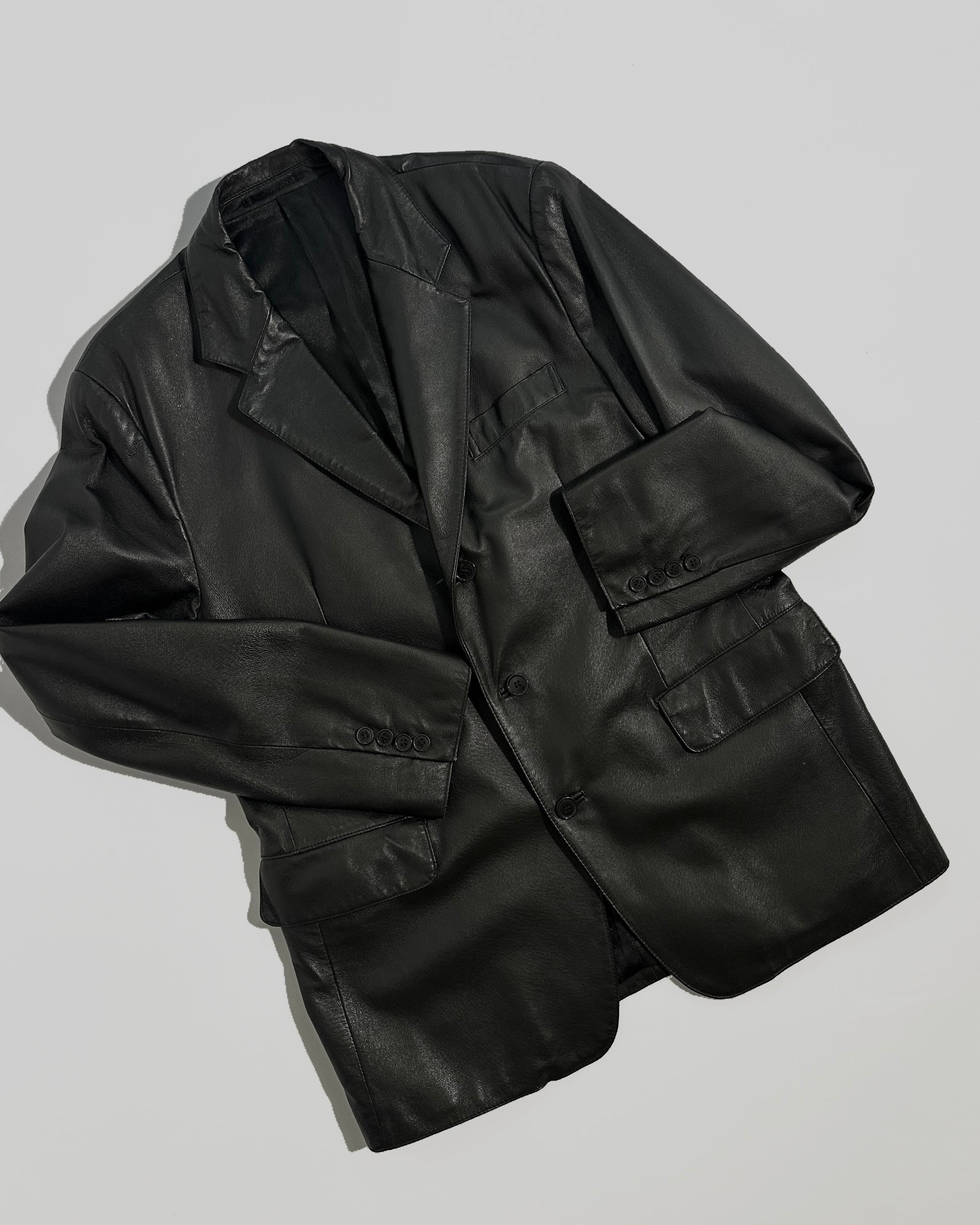 Vintage 1990s black leather blazer with a classic single breasted cut. Features wide notch lapels, three-button cuffs, and flap front pockets. Designed in a slightly oversized silhouette, fully lined for comfort and layering. A sharp yet versatile piece that captures the clean tailoring of the decade.