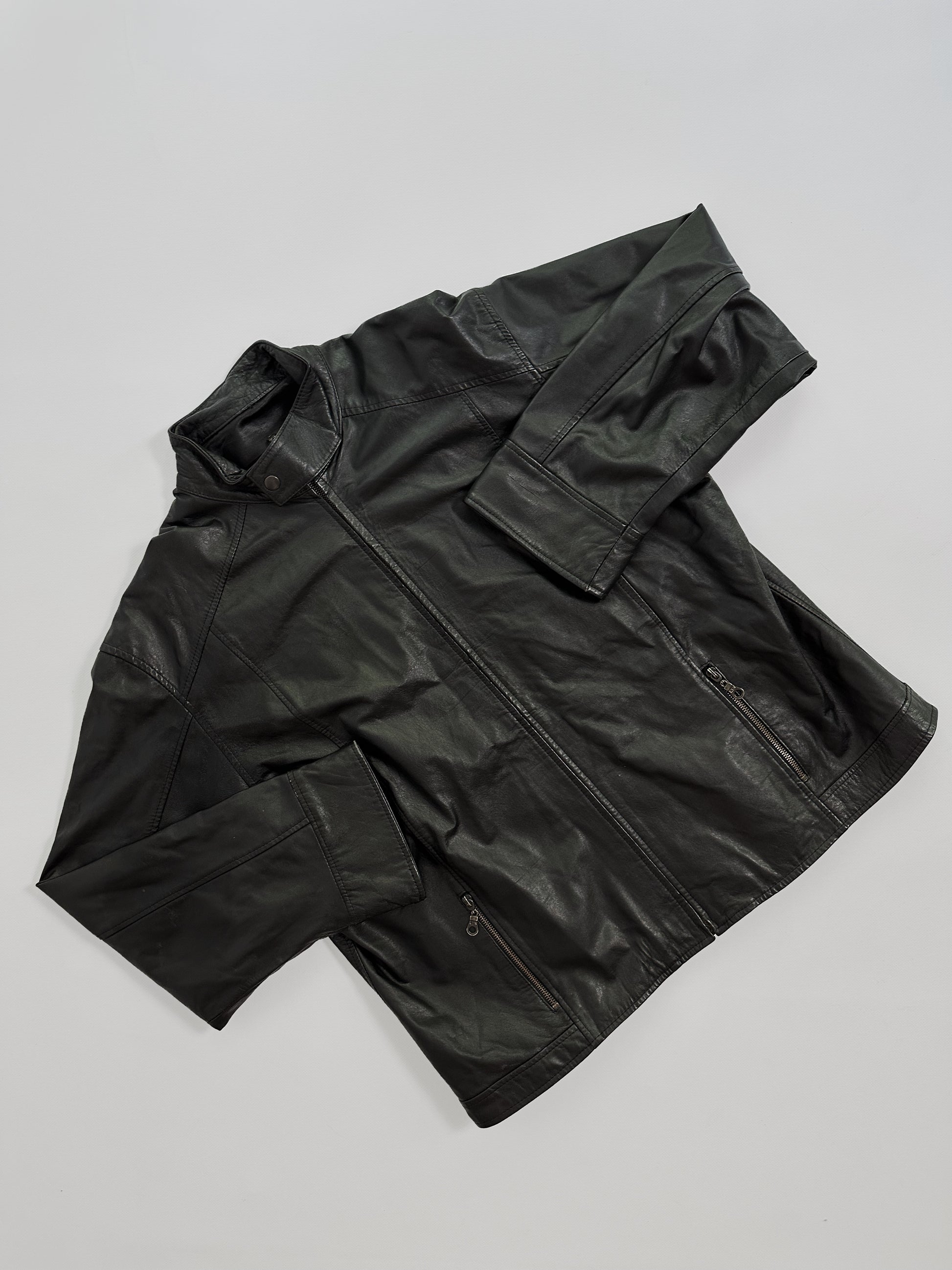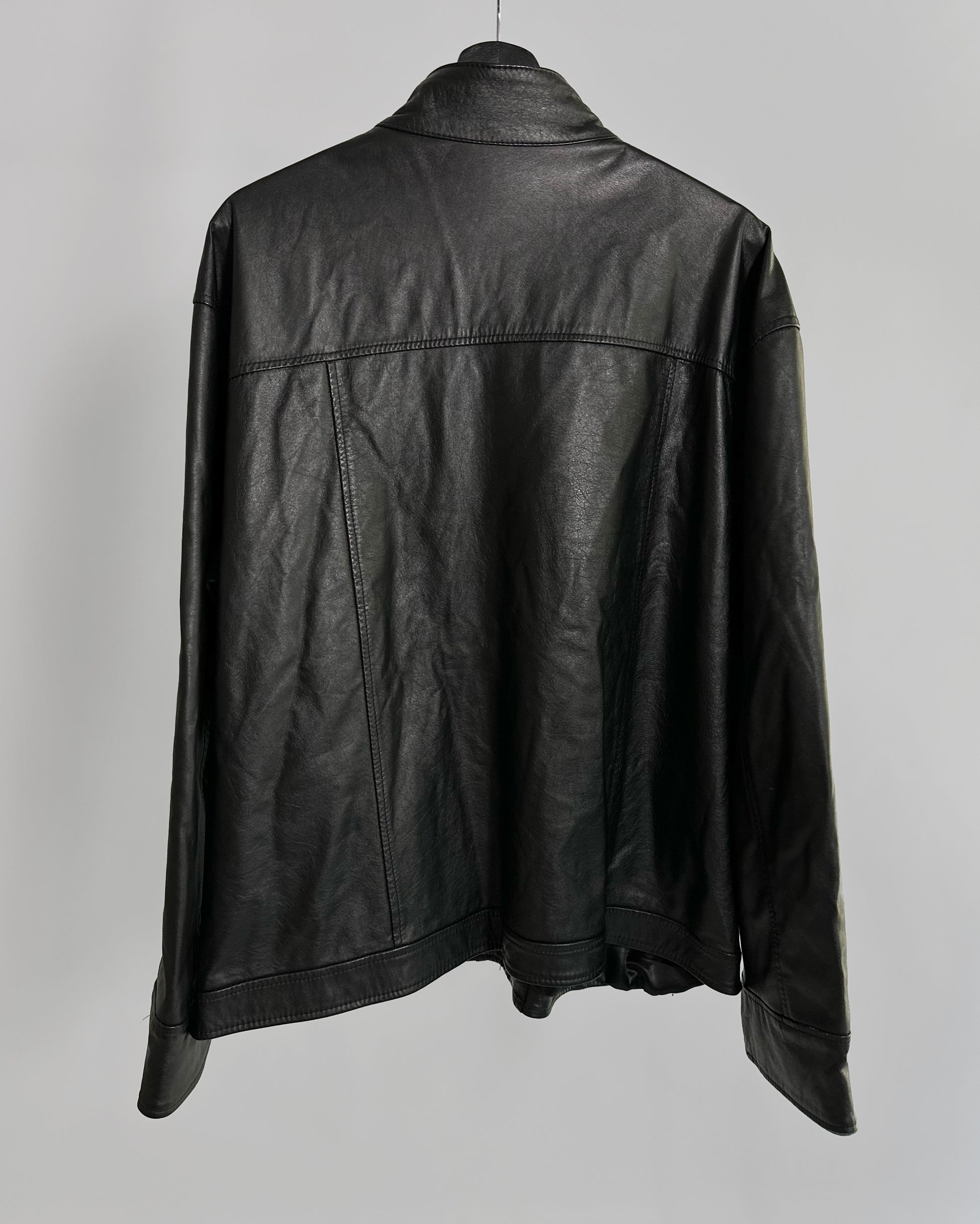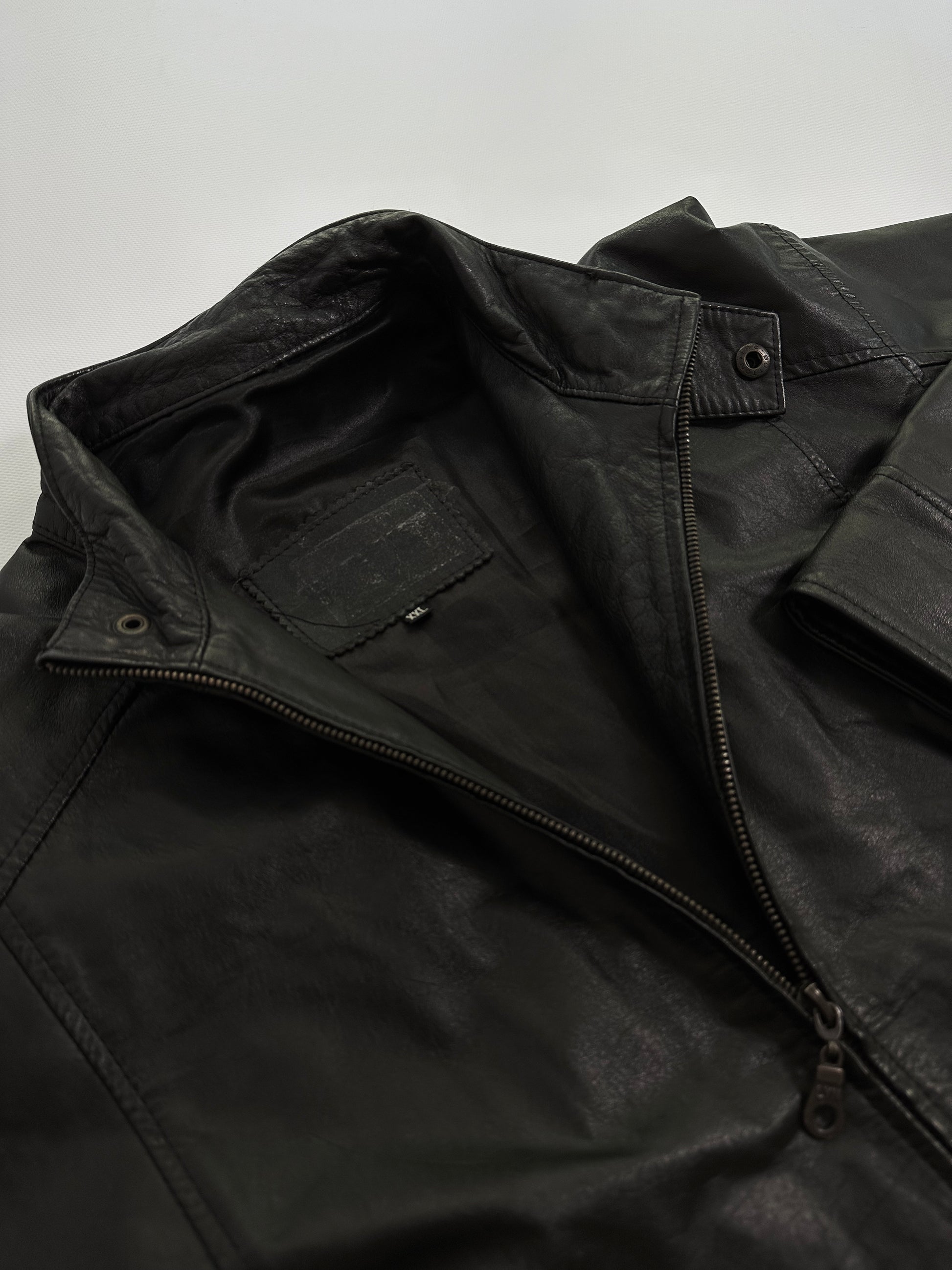 Vintage 1990s genuine leather jacket with a clean, minimalist silhouette. Features a stand collar with snap-tab closure, front zip fastening, and two vertical zipped pockets. Fully lined for comfort and structure. Crafted in 100% leather with subtle panel detailing. A timeless staple with understated edge.