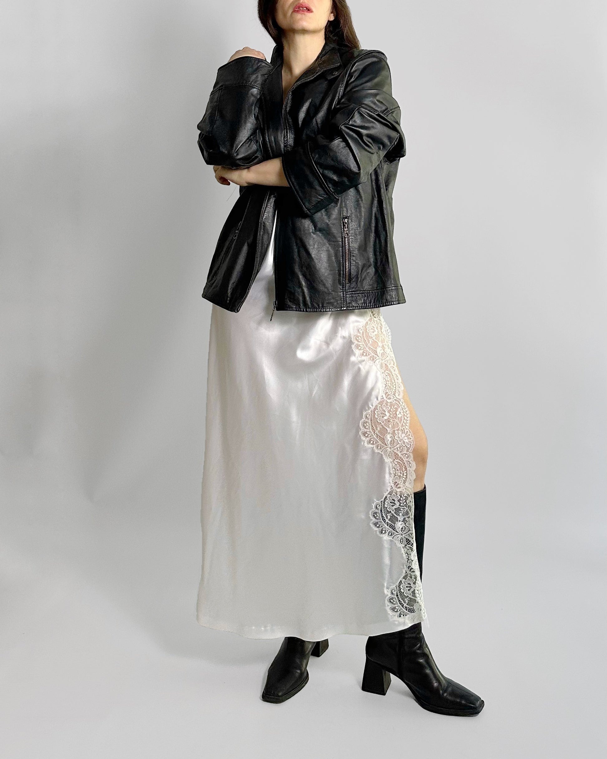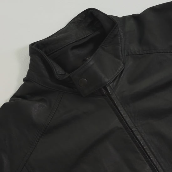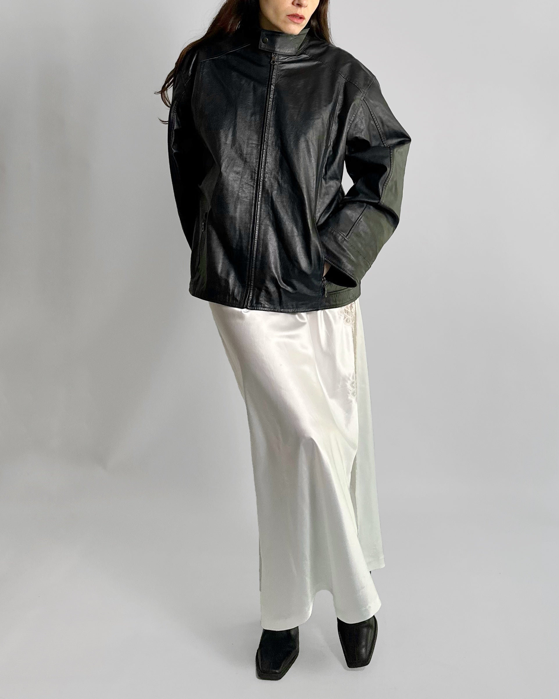 Vintage 1990s genuine leather jacket with a clean, minimalist silhouette. Features a stand collar with snap-tab closure, front zip fastening, and two vertical zipped pockets. Fully lined for comfort and structure. Crafted in 100% leather with subtle panel detailing. A timeless staple with understated edge.