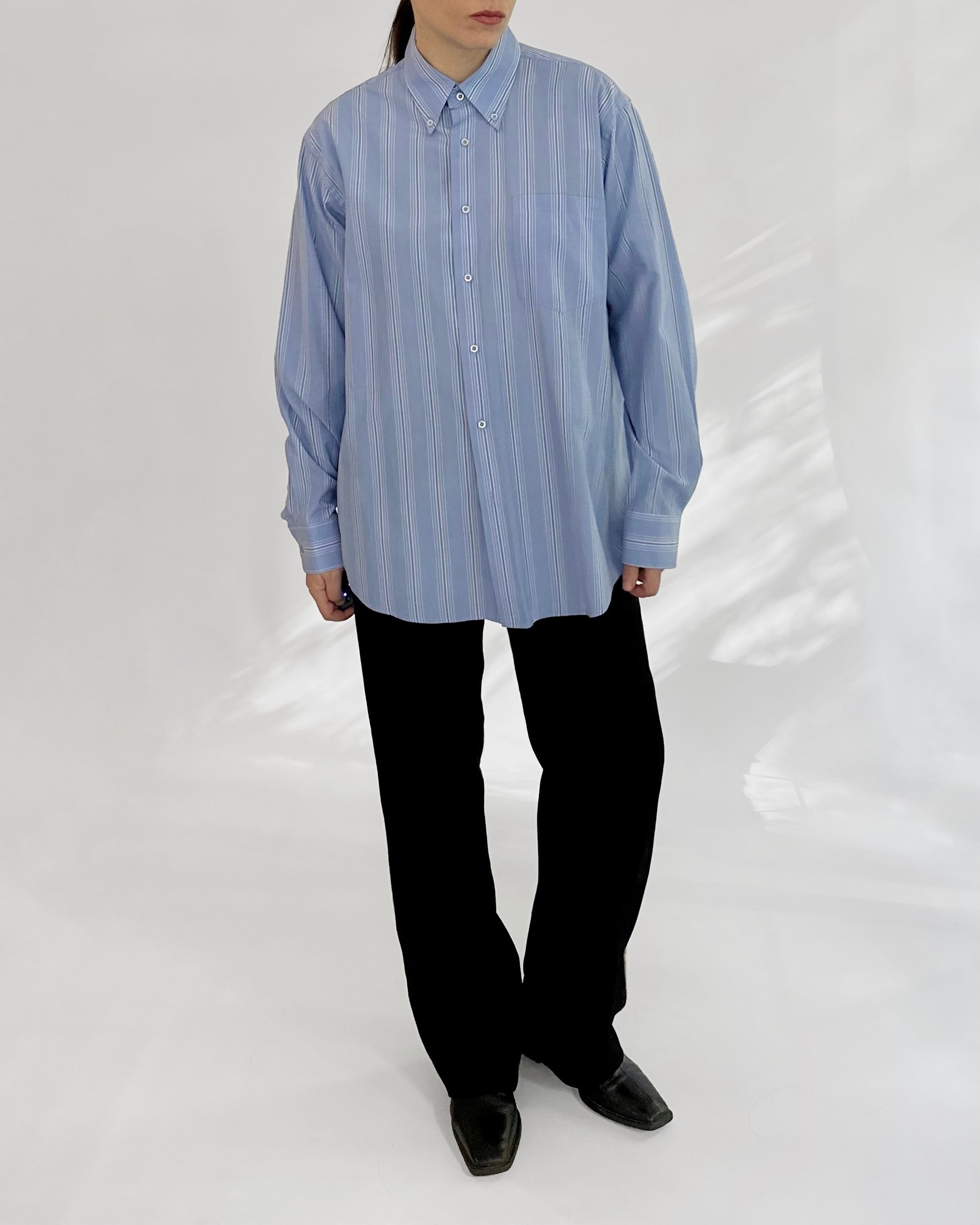 Vintage 1990s blue striped shirt in pure cotton. Designed with a classic button-down collar, front button placket, and a single chest pocket. Long sleeves with button cuffs and a relaxed straight fit. Lightweight and breathable, perfect for everyday wear with a timeless, clean silhouette.