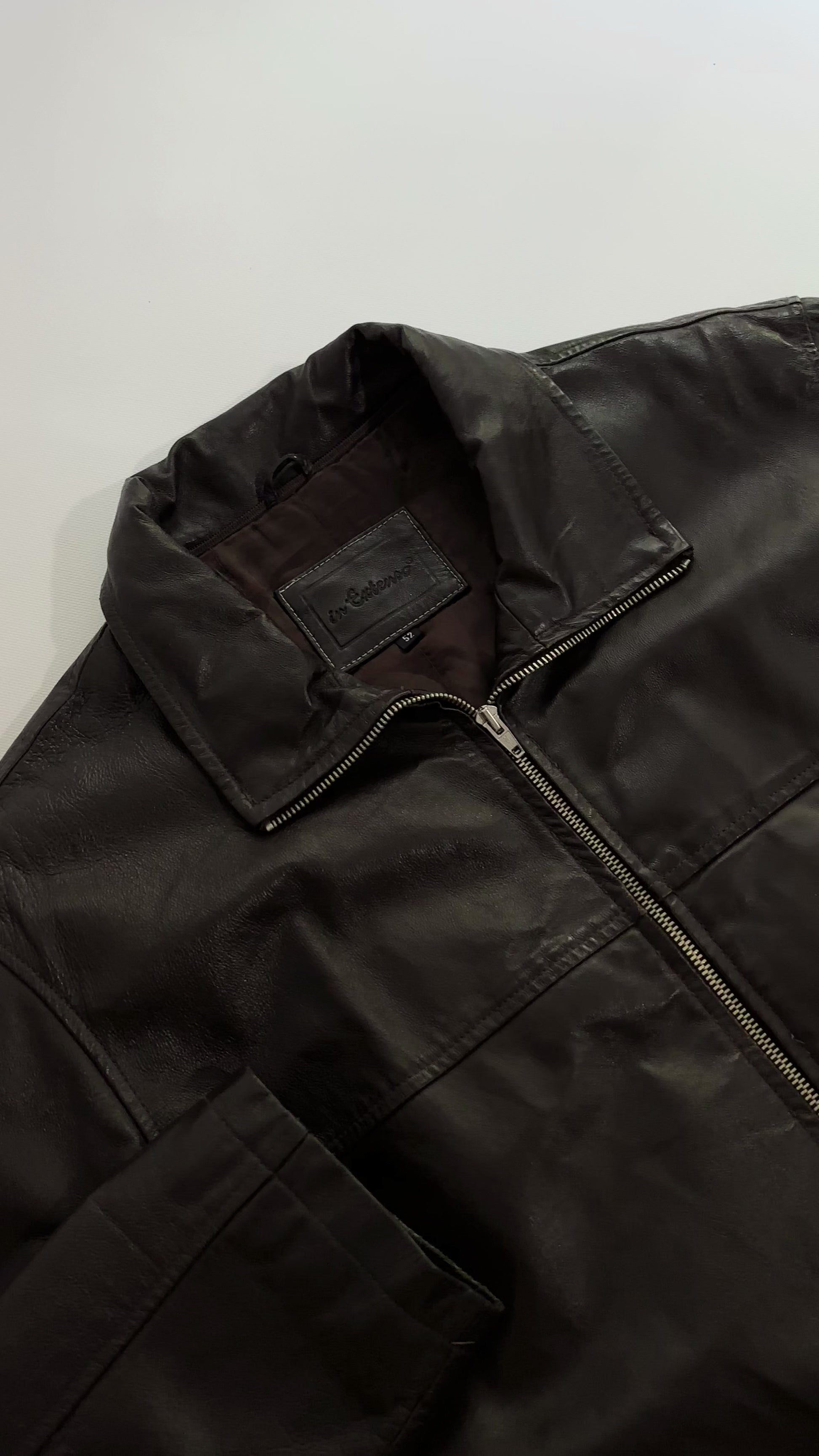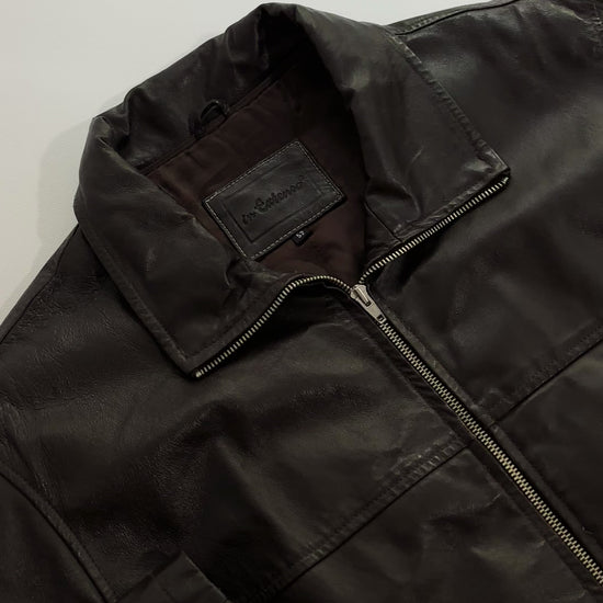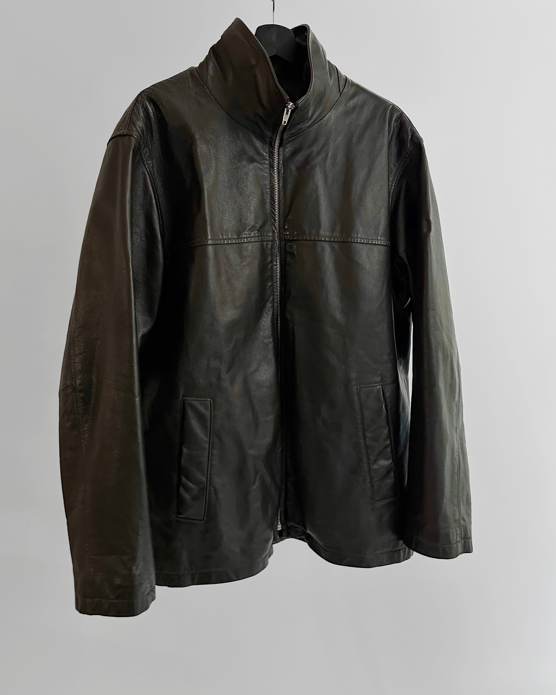 Vintage late 1990s brown leather jacket with a clean, hip-length silhouette. Designed with a zip front and a convertible collar that wears open or zipped to a stand, it features two vertical slit pockets and neat seaming. Fully lined for comfort and structure. A timeless everyday layer with understated 90s polish.