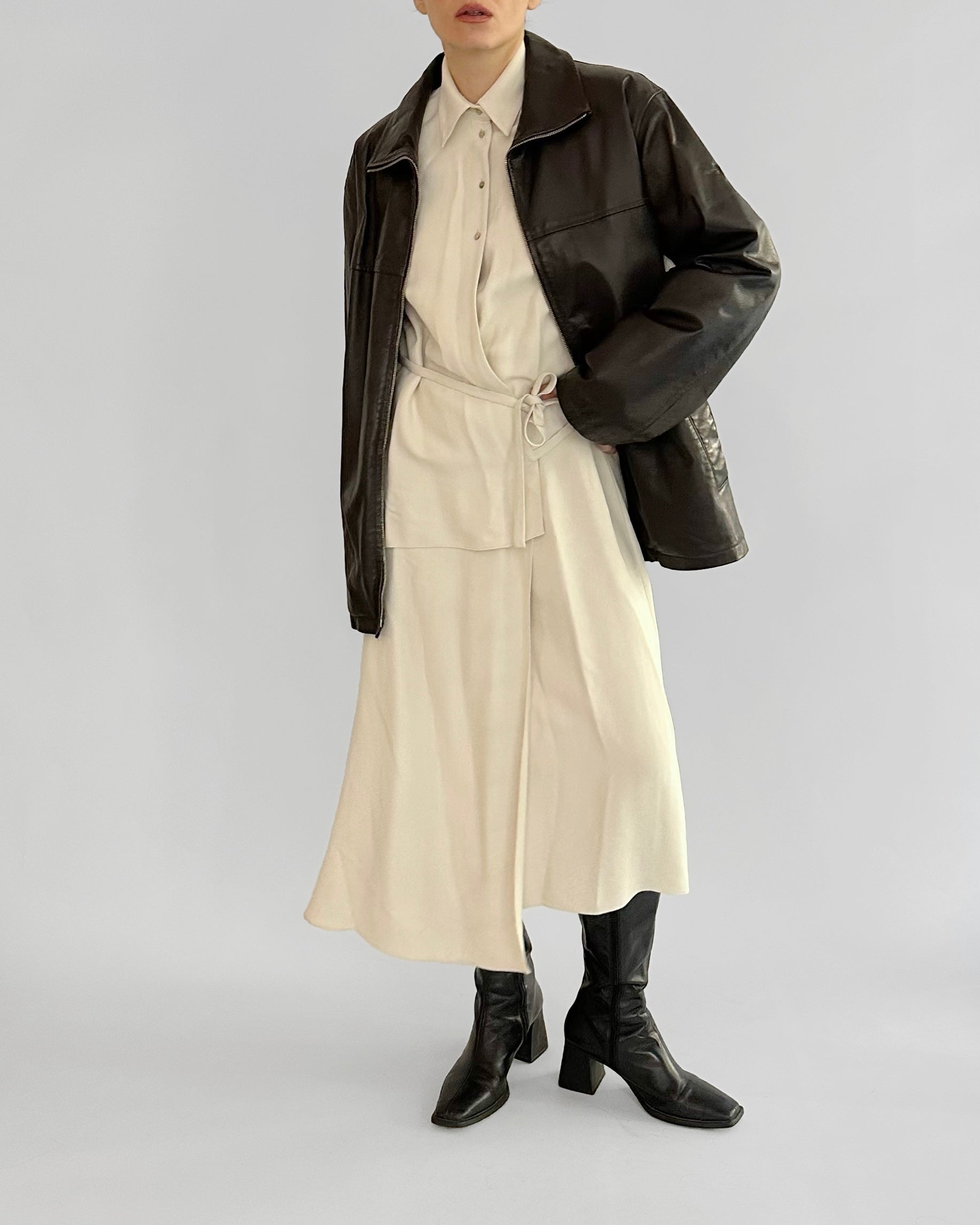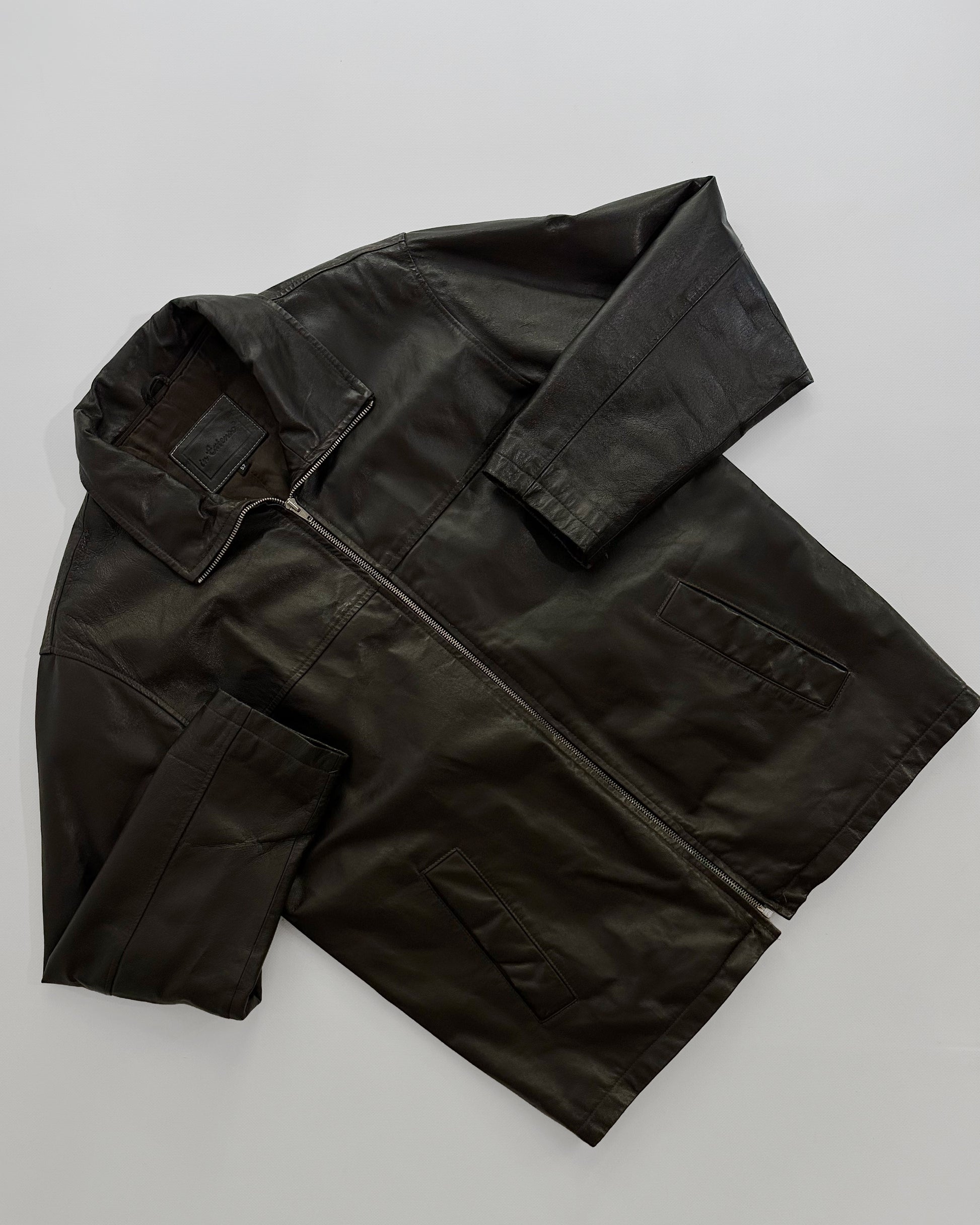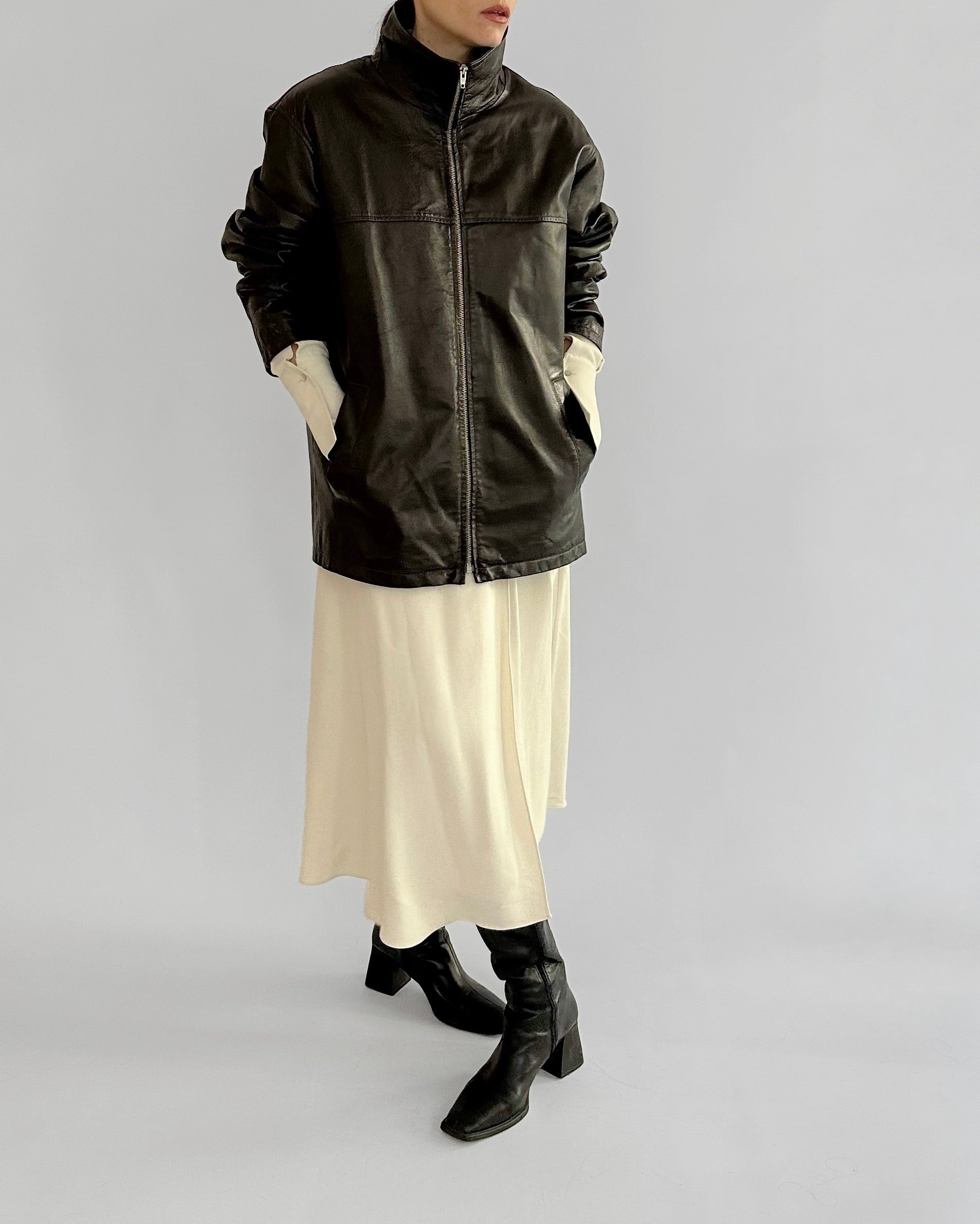 Vintage late 1990s brown leather jacket with a clean, hip-length silhouette. Designed with a zip front and a convertible collar that wears open or zipped to a stand, it features two vertical slit pockets and neat seaming. Fully lined for comfort and structure. A timeless everyday layer with understated 90s polish.