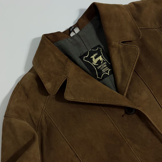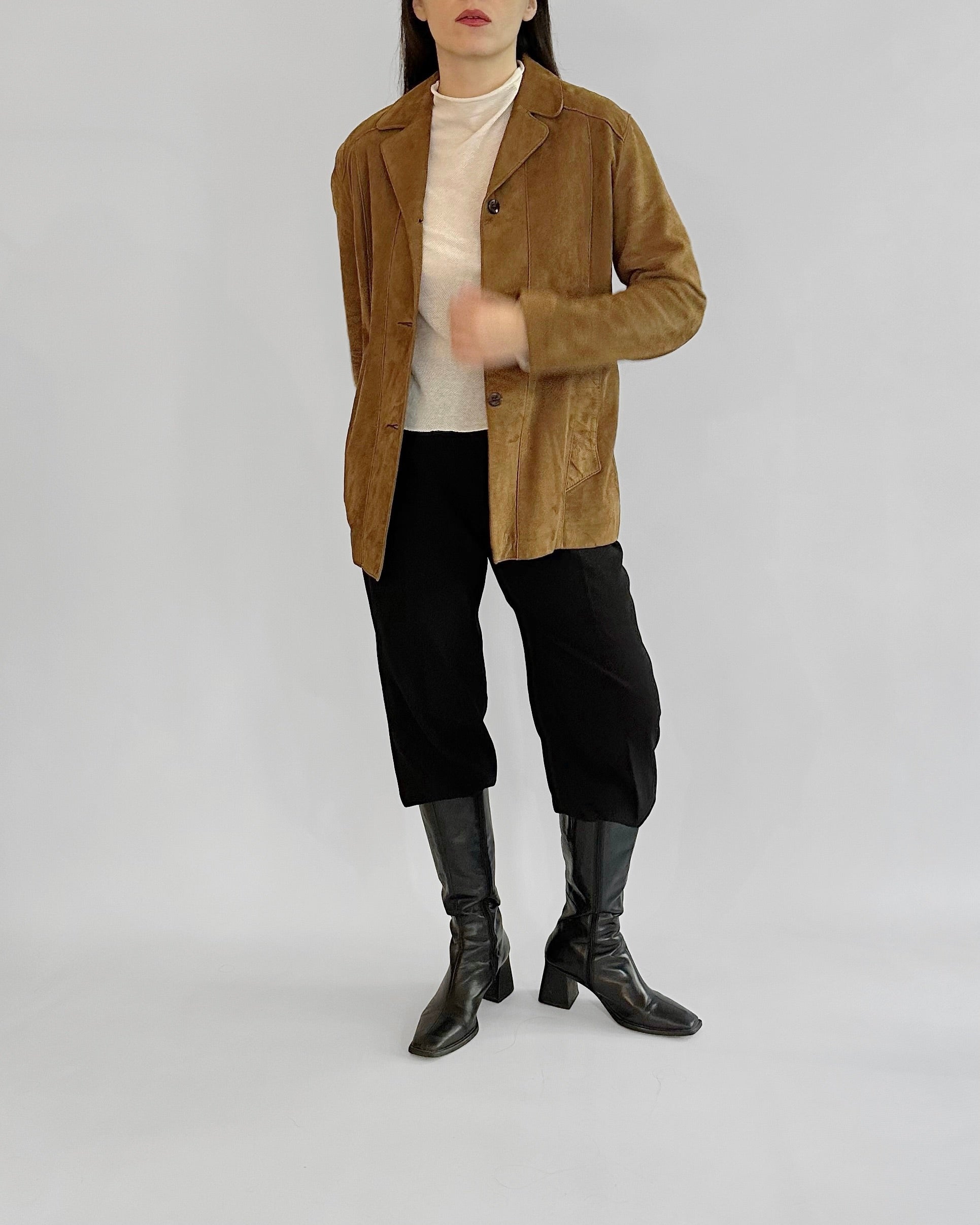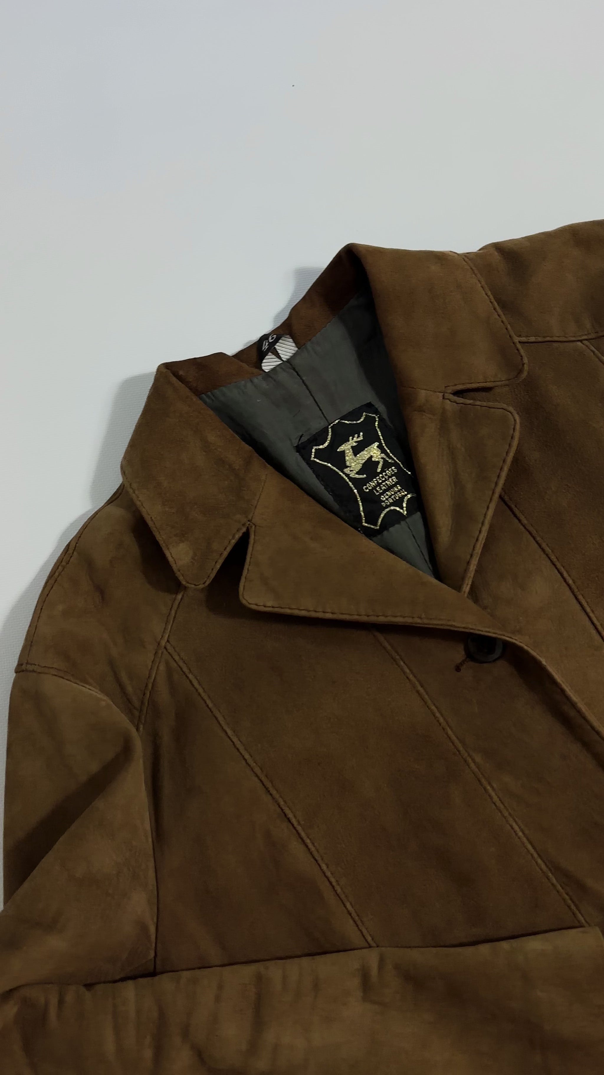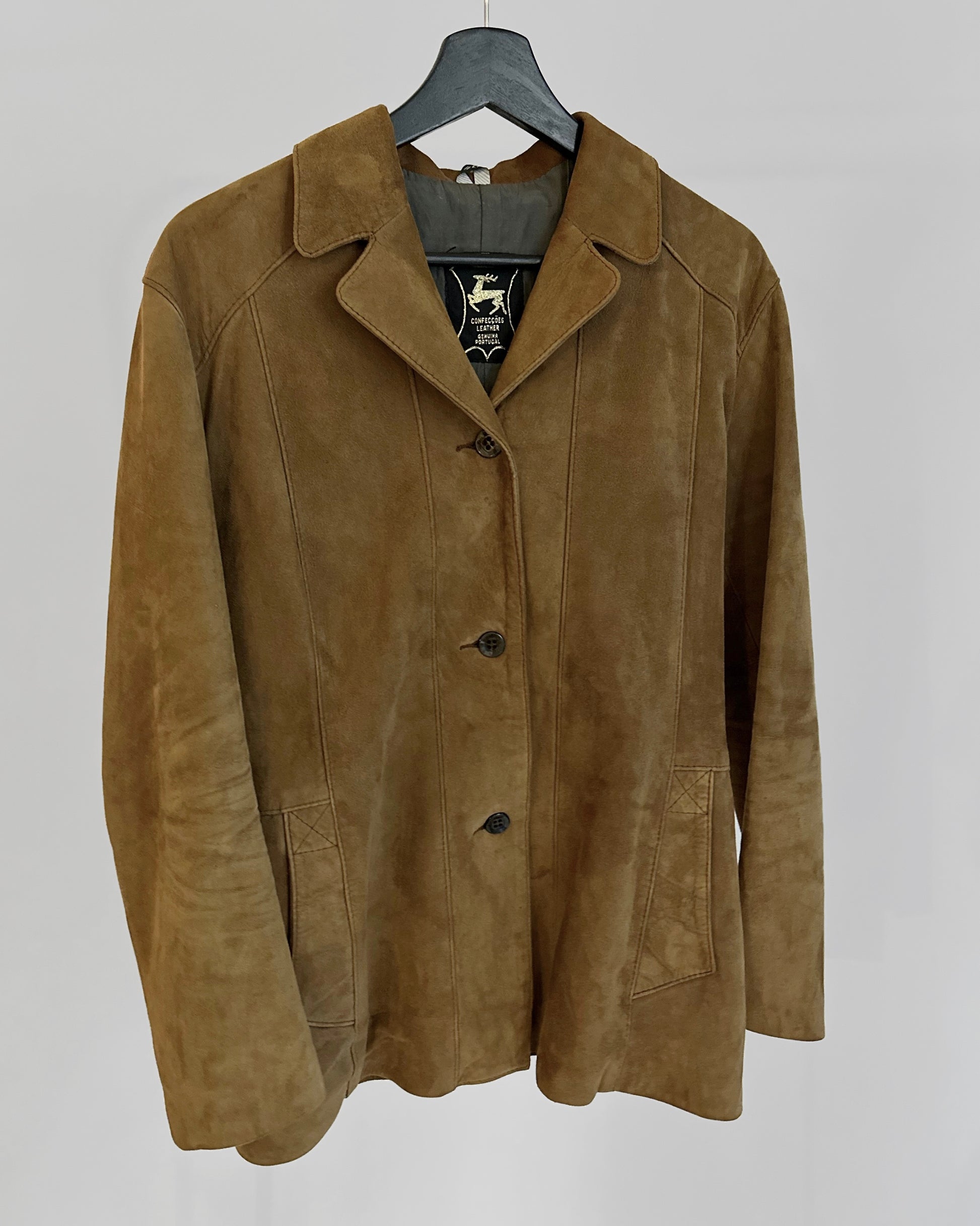 Vintage 1990s suede jacket made in Portugal from soft brown suede. Designed with a relaxed, unstructured silhouette, it features a notched collar, three-button closure, and two large front pockets with subtle stitched detailing. Fully lined for comfort, this understated piece captures the minimalist elegance of 1990s casual tailoring.
