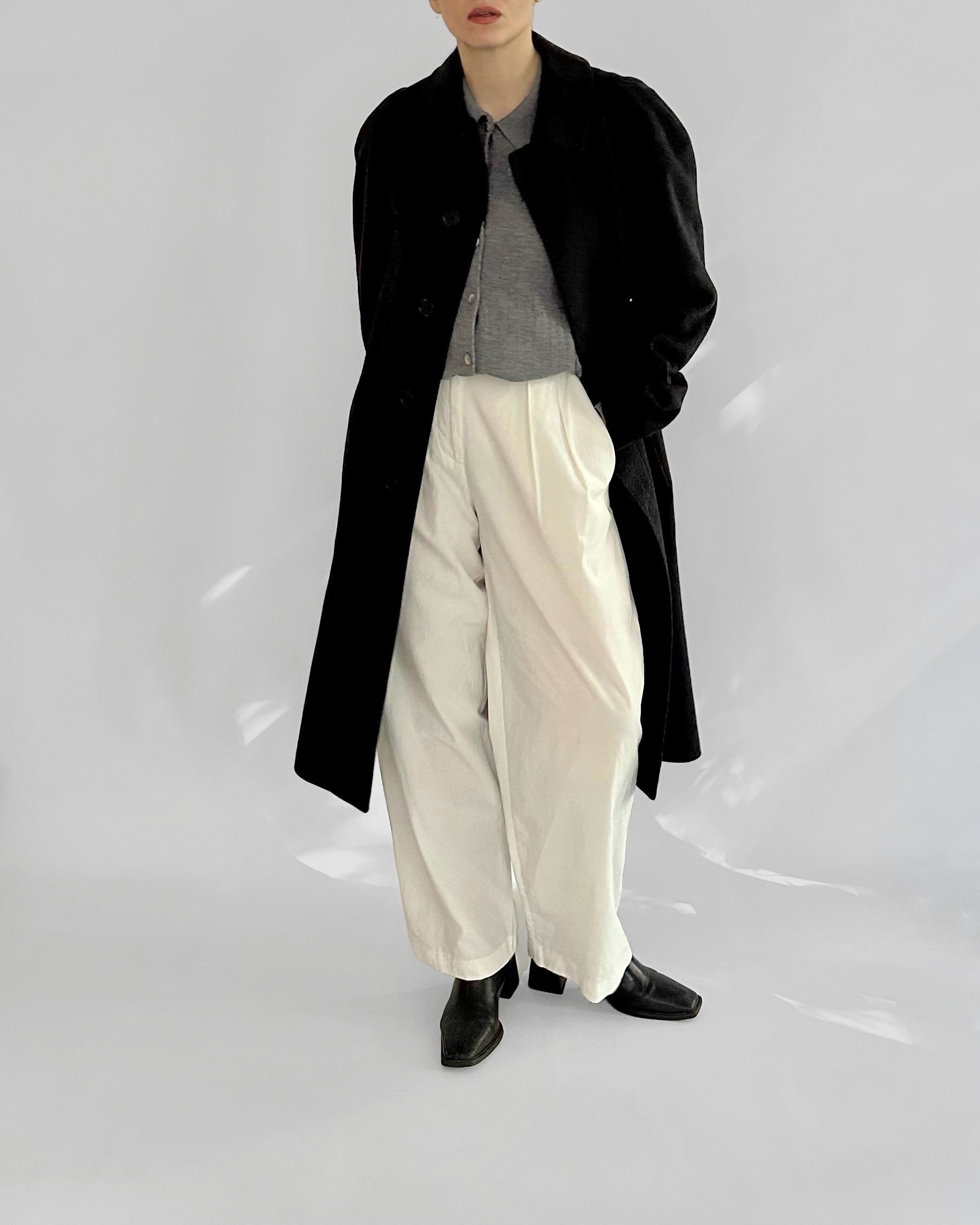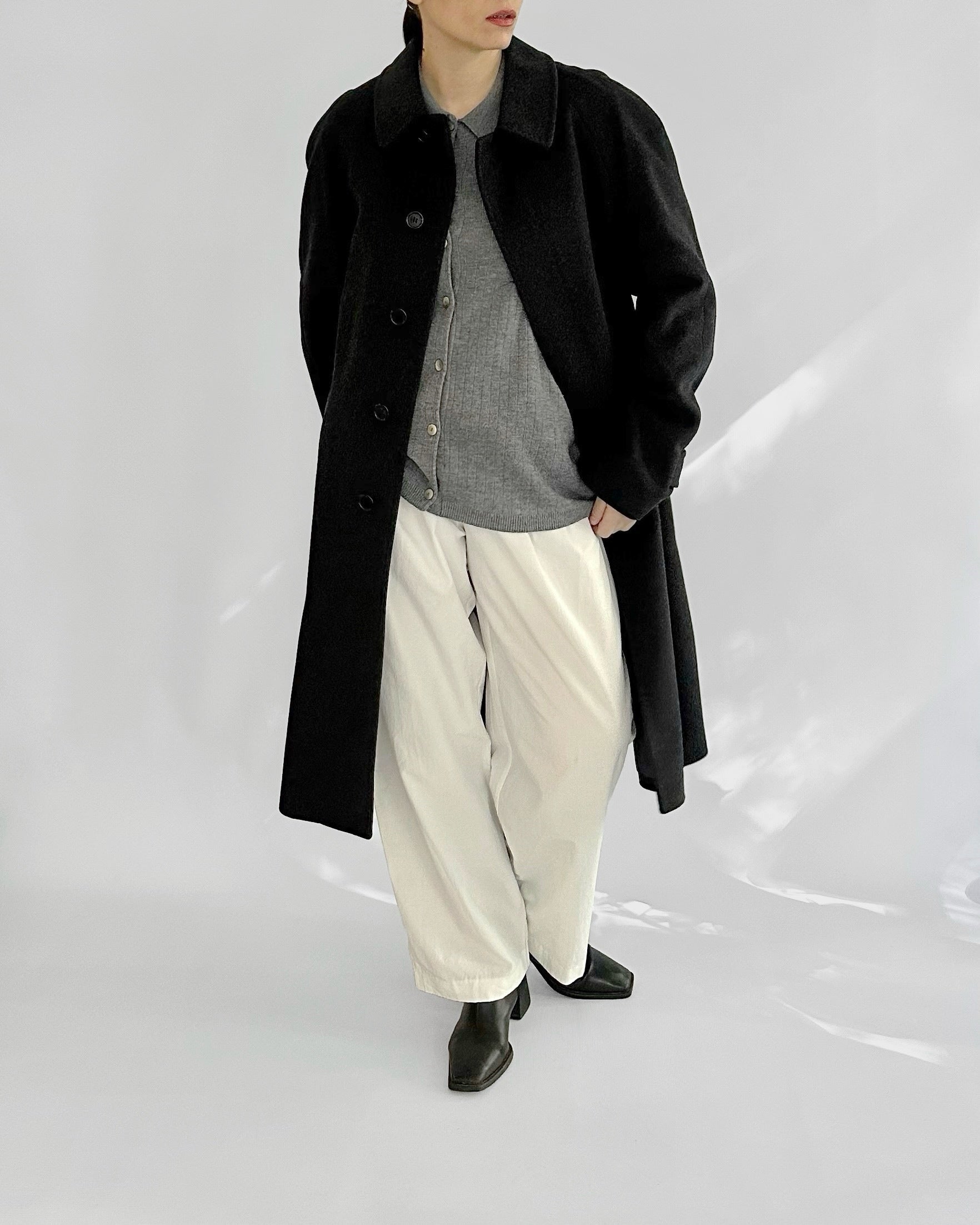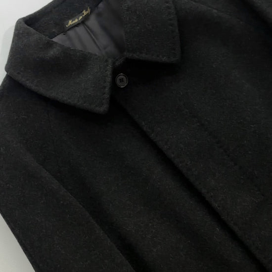 Vintage 1990s Gianfranco Ferré Studio charcoal wool and cashmere coat with a clean, structured silhouette and understated refinement. Made in Italy, it features a classic spread collar, concealed button placket, and adjustable tab cuffs. Fully lined for comfort and warmth, with side welt pockets for practicality. A sophisticated outerwear piece that captures Ferré’s signature minimalist elegance.
