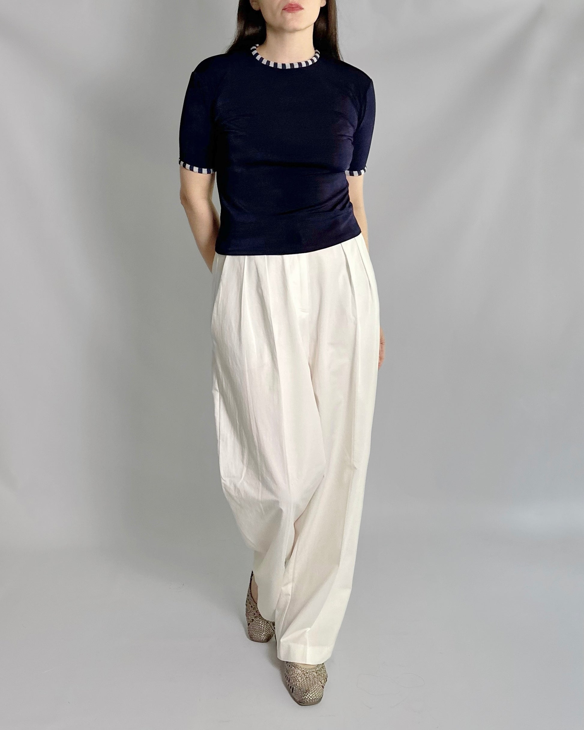 Vintage 1990s navy short sleeve top with a minimalist silhouette and subtle sport-inspired details. Features a round neckline with contrasting navy and white striped collar and matching cuffs. Made from a soft blend of fibrana and polyester with an elasticated hem for comfort and shape. A clean and timeless piece, perfect for casual everyday wear.