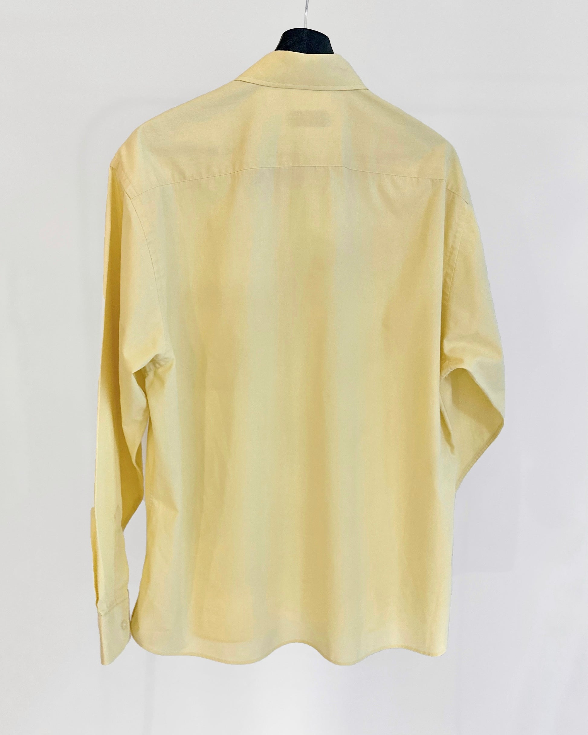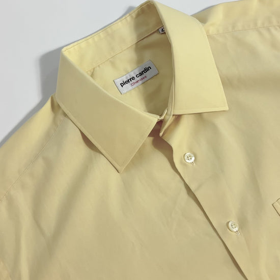 Vintage 1990s Pierre Cardin butter yellow shirt in cotton blend with a clean, classic silhouette. Made from crisp lightweight fabric, it features a pointed collar, a single chest pocket embroidered with the signature Pierre Cardin logo, and buttoned cuffs. Designed with a straight hem and relaxed fit, it’s a refined piece that blends everyday ease with understated elegance.