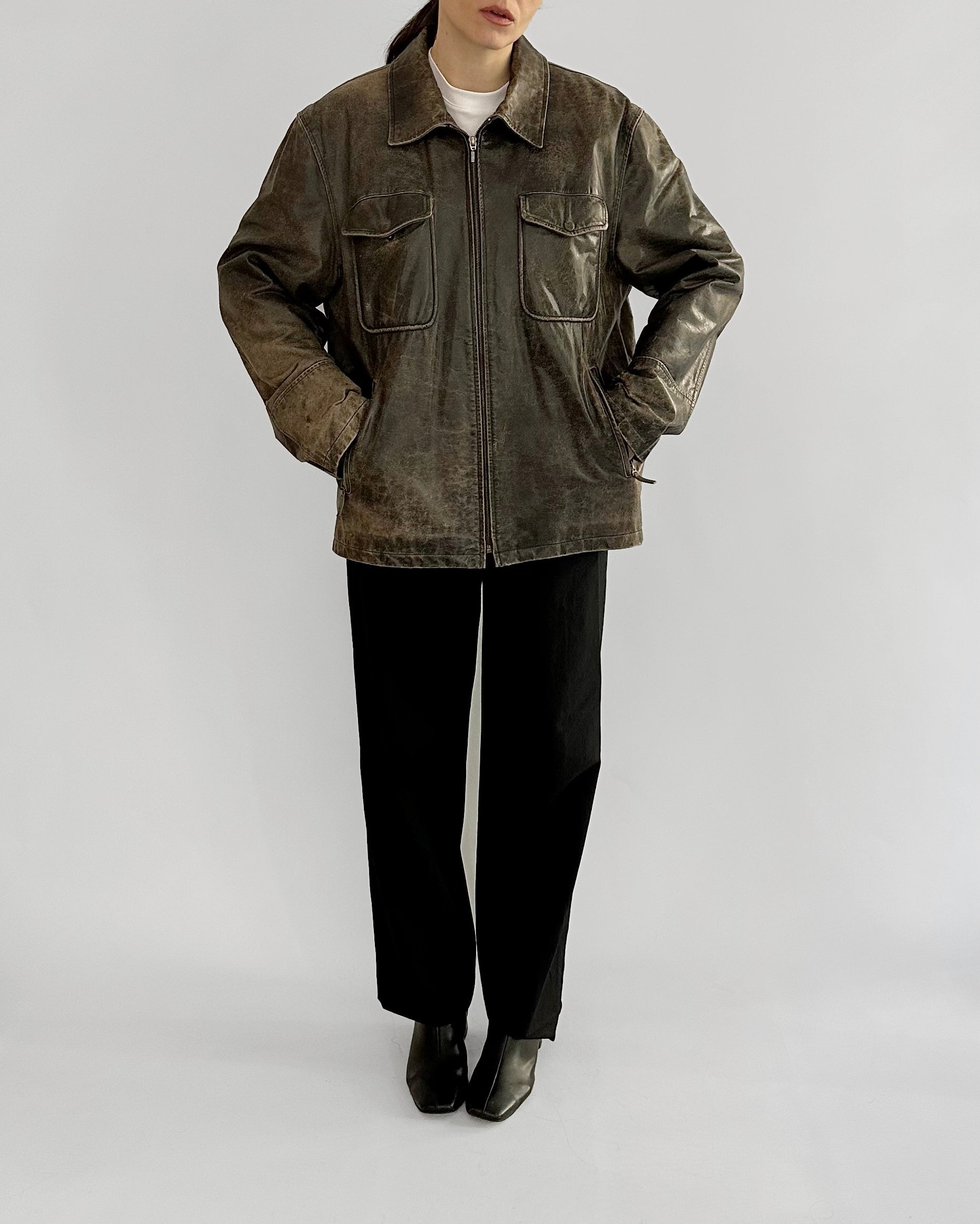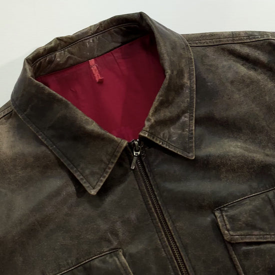 Sominemi brown leather jacket with a naturally distressed finish and a straight, hip-length cut. Designed with a pointed collar, front zip closure, and two button-flap chest pockets. Features two vertical zip hand pockets and a contrasting red lining for comfort and structure. A classic, easy-to-wear leather jacket with rich texture and character.