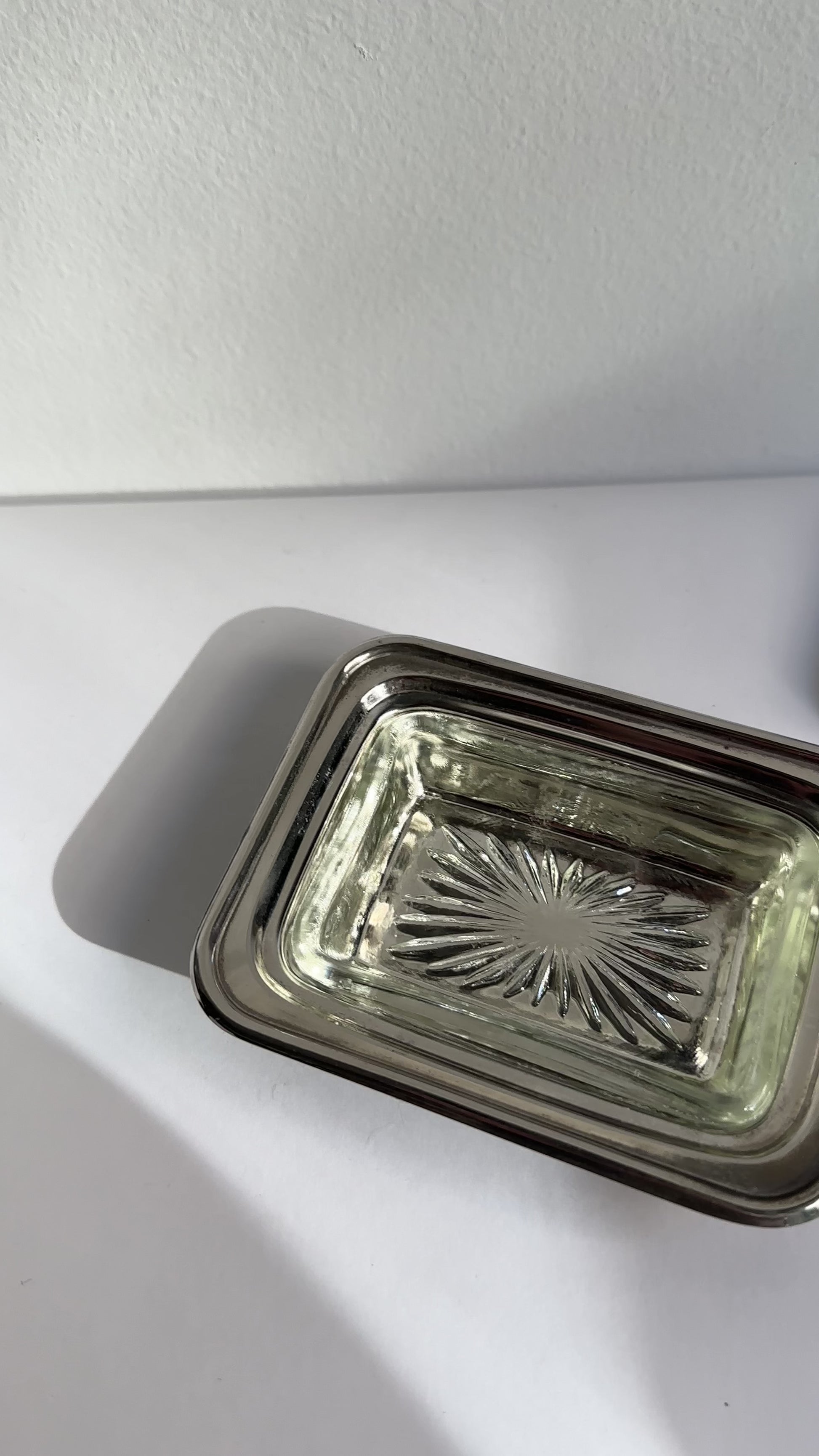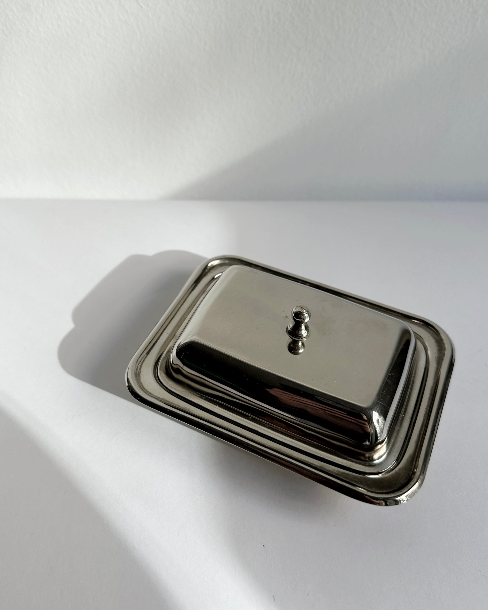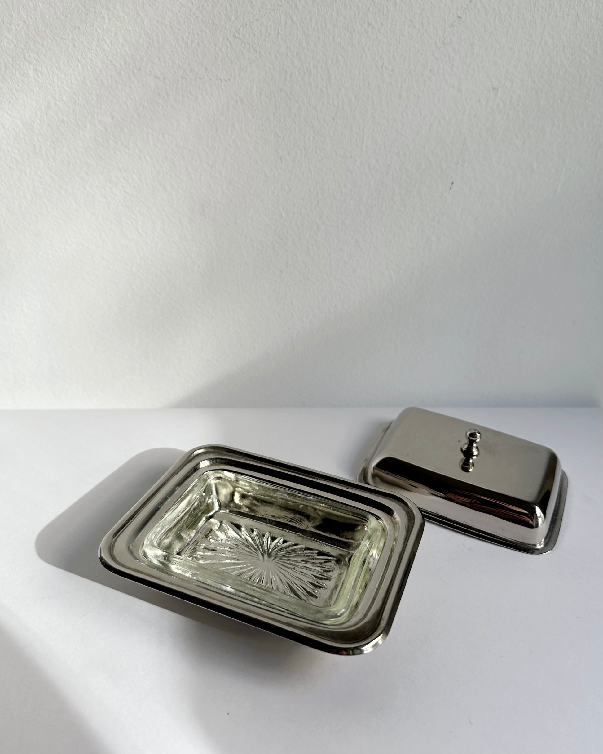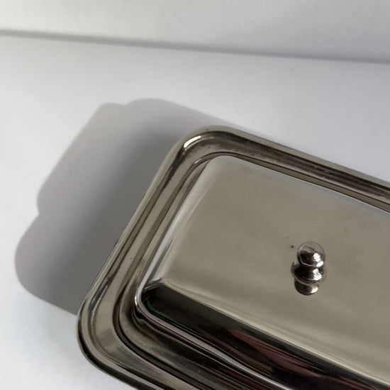 The clean, functional silhouette reflects mid-century tableware design, balancing practicality with understated elegance. Designed to keep butter fresh and neatly presented, the combination of metal and glass adds subtle contrast and visual interest. A refined vintage set suitable for everyday use or as a decorative table accent