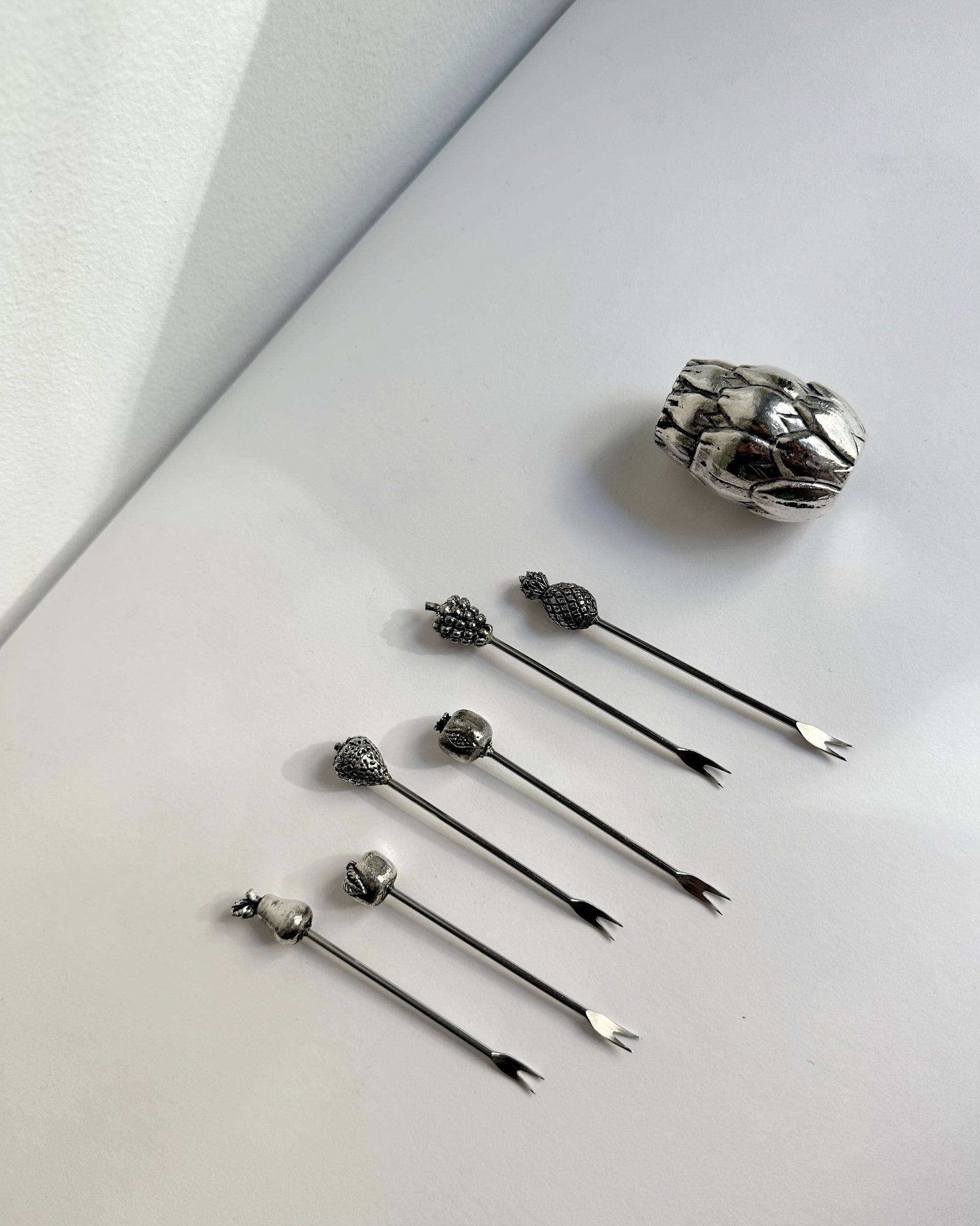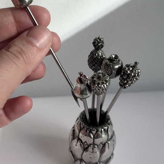 Vintage cocktail picks set likely dating to the 1960s, composed of six silver plated picks with decorative fruit-shaped finials and a matching holder. Each pick features a slim metal stem with a small two-prong tip, designed for serving olives, fruit, or garnishes.The sculptural tops display varied fruit textures, adding visual interest while maintaining a cohesive design. The set combines functional barware with decorative appeal, suitable for cocktail service or as a styled tabletop accent.