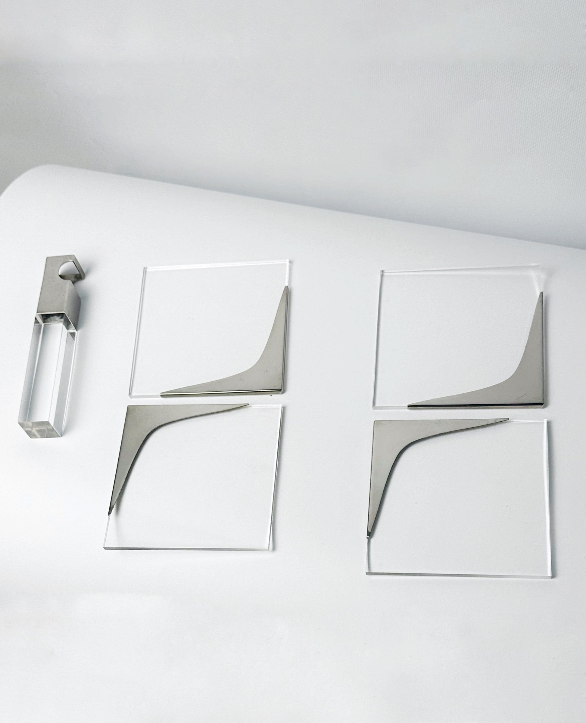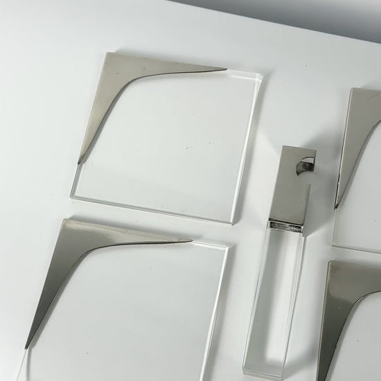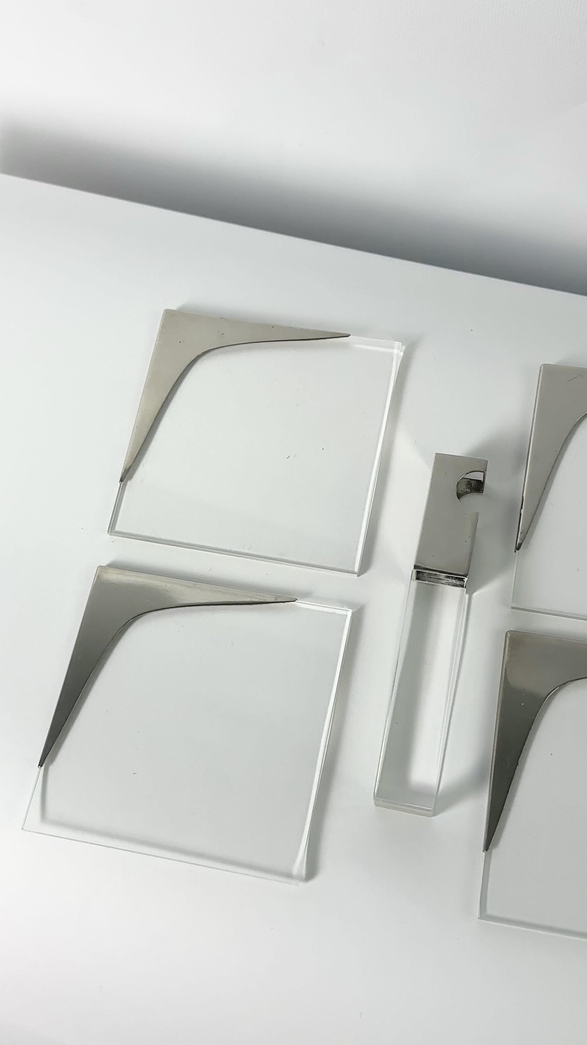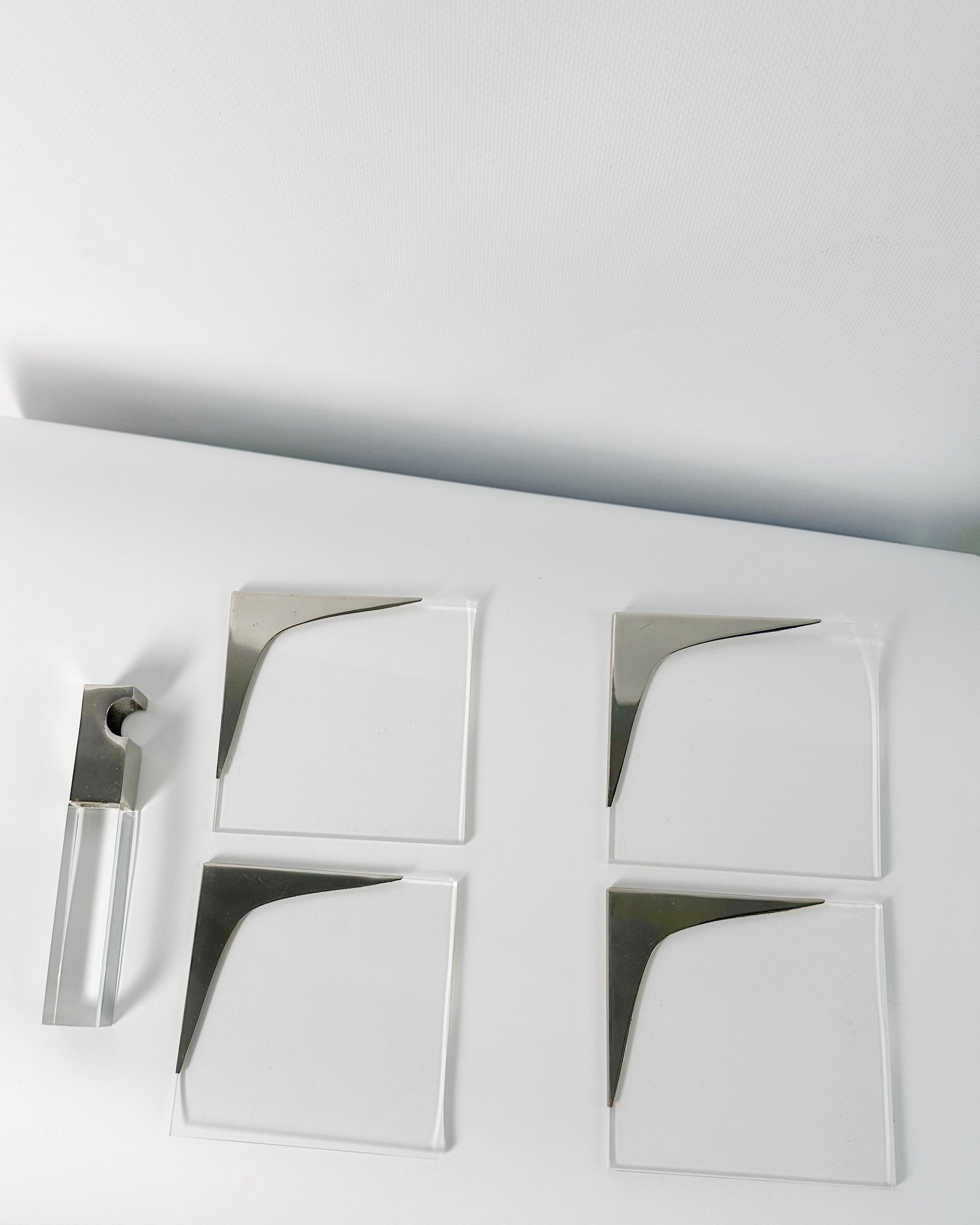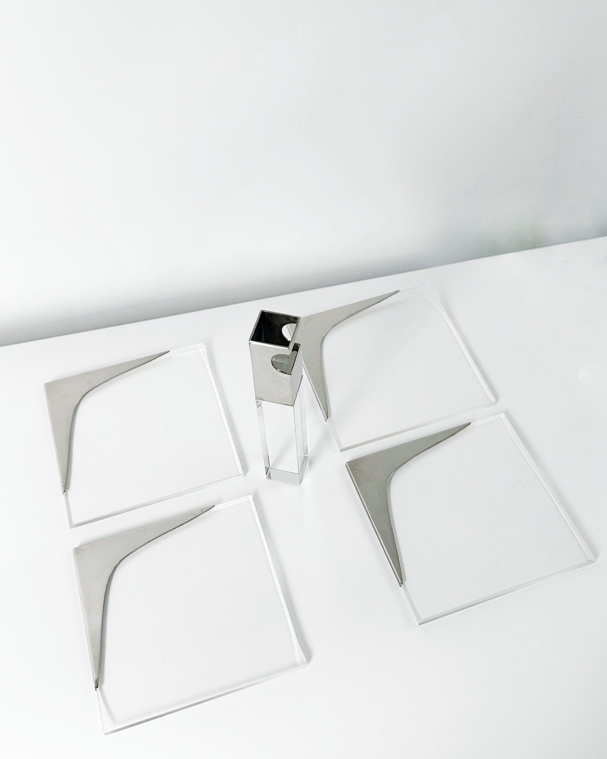 Vintage 1970s modernist bar set featuring a stainless steel bottle opener and four matching lucite coasters.