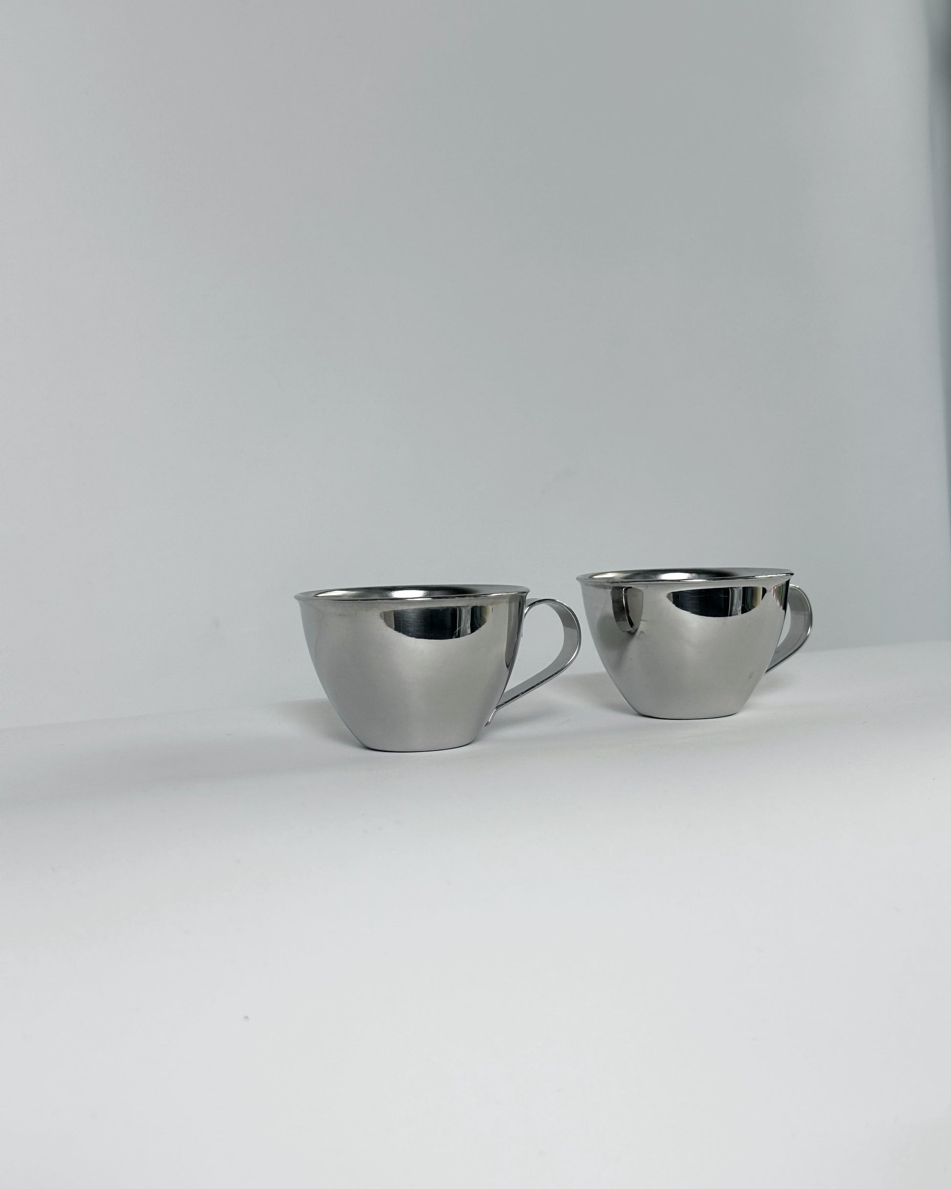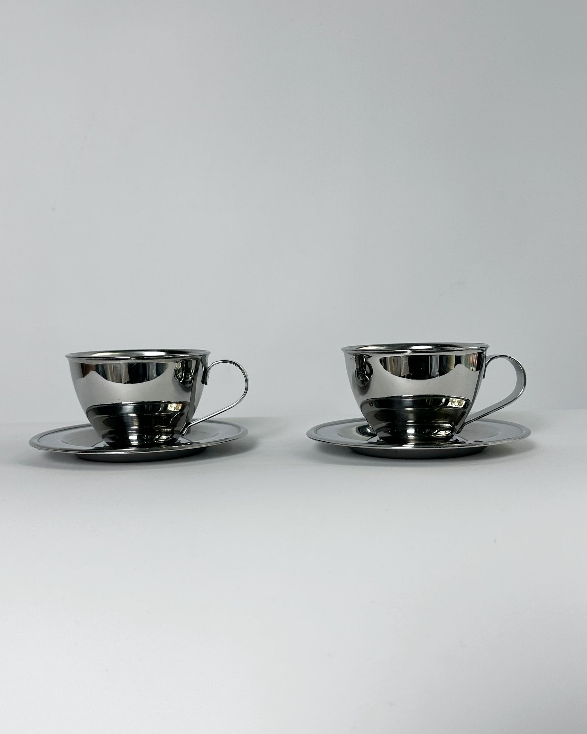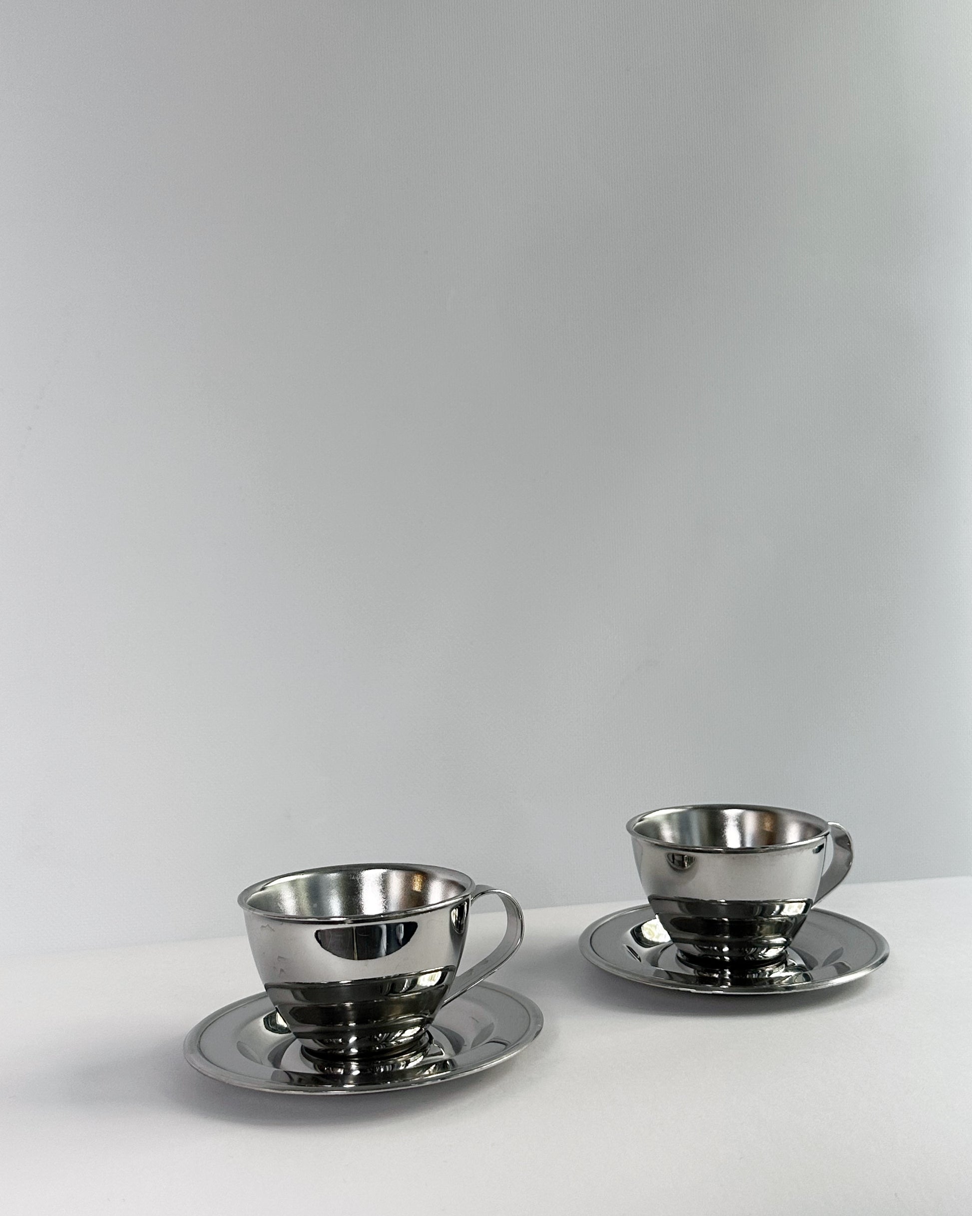 Vintage 1970s Italian Stainless Steel Espresso Cups & Saucers (Nanni P&B) – Set of 2 (3 Sets Available)