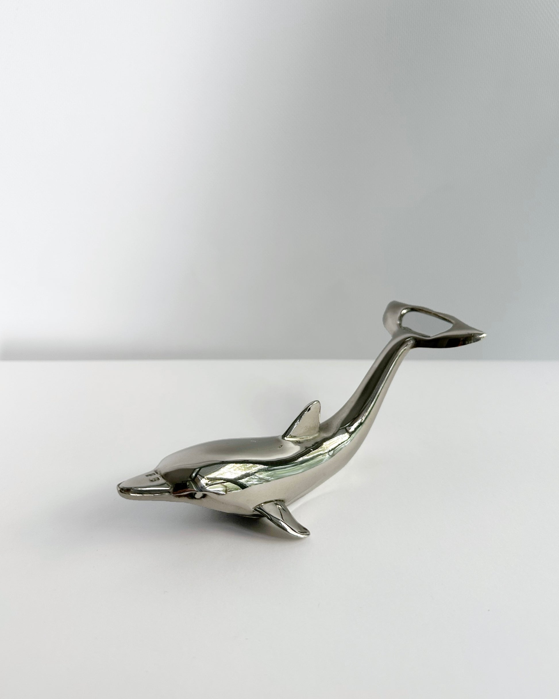 Vintage 1980s silver-plated bottle opener in the shape of a streamlined dolphin. Designed as a two-way opener, it features both a bottle-cap opener at the tail and a twist-top mechanism underneath. Sculptural and polished, it brings a playful touch to barware collections while remaining fully functional.