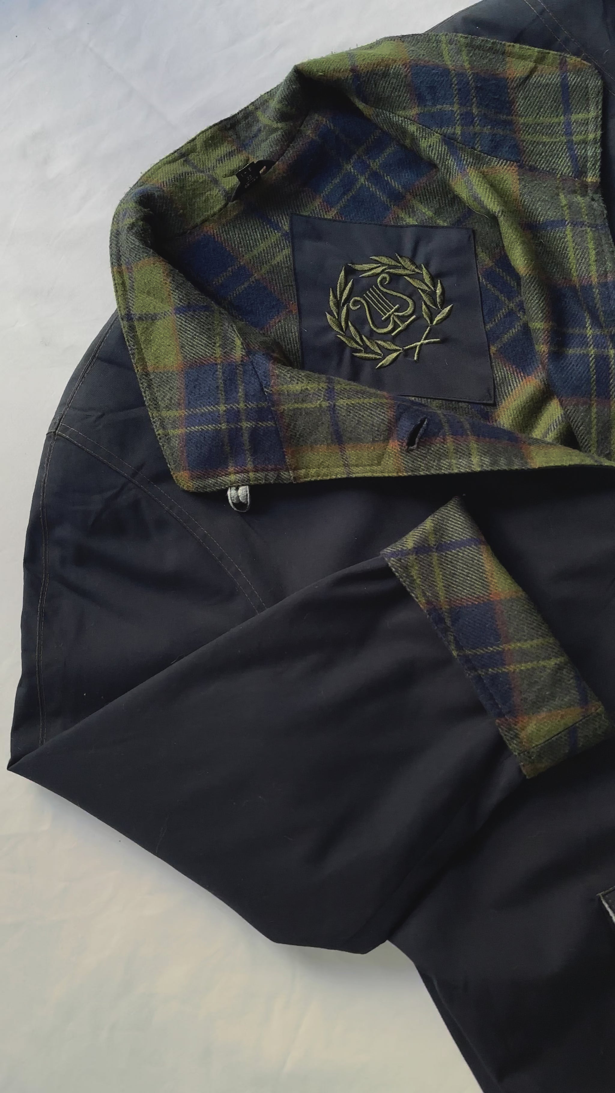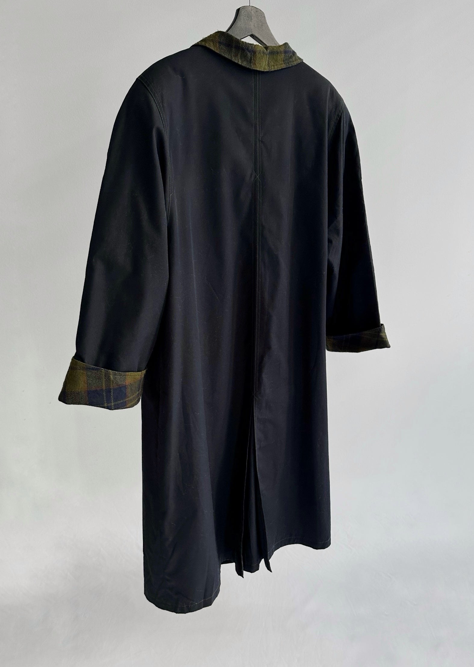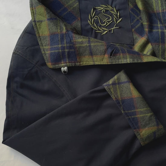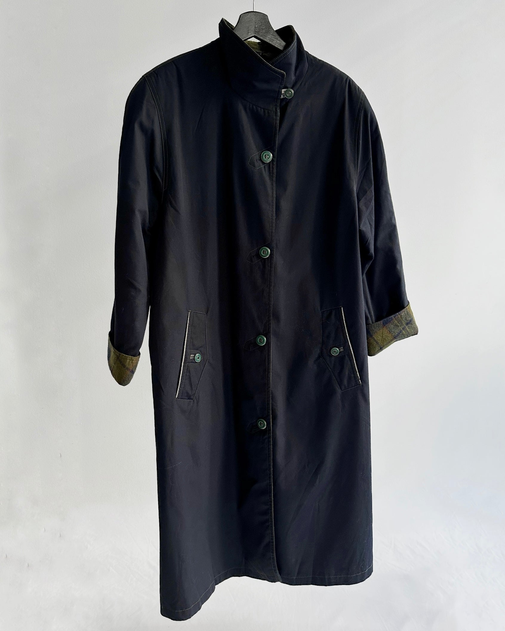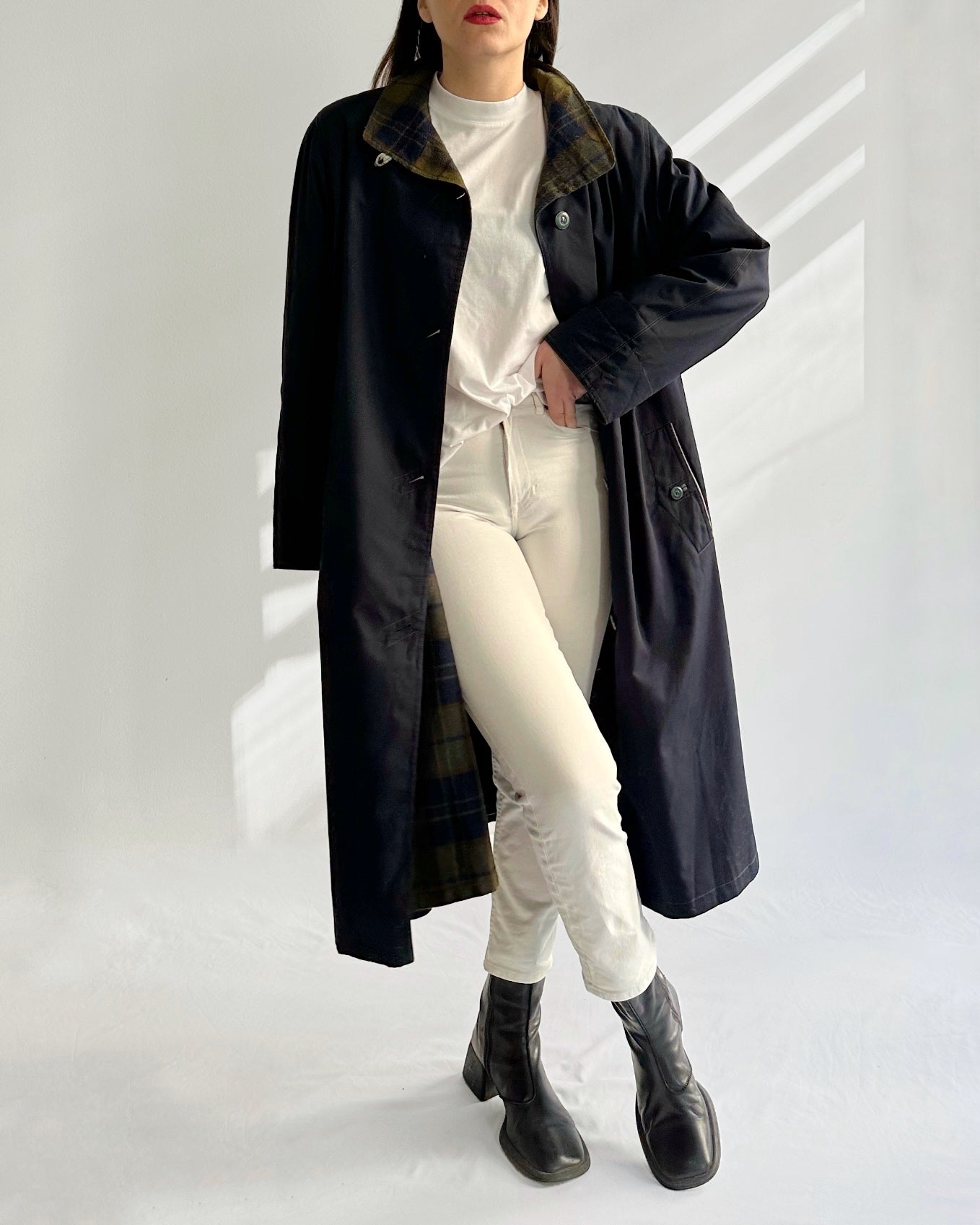 Vintage 1990s navy trench coat with a clean, minimalist silhouette. Crafted from a cotton-poly blend, it features a full plaid acrylic lining for added warmth and for a striking contrast. Details include a high button-up collar, green statement buttons, padded shoulders and structured front pockets with contrast trim. The relaxed fit and mid-weight fabric make it ideal for transitional weather. A timeless, functional, and stylish outerwear essential.