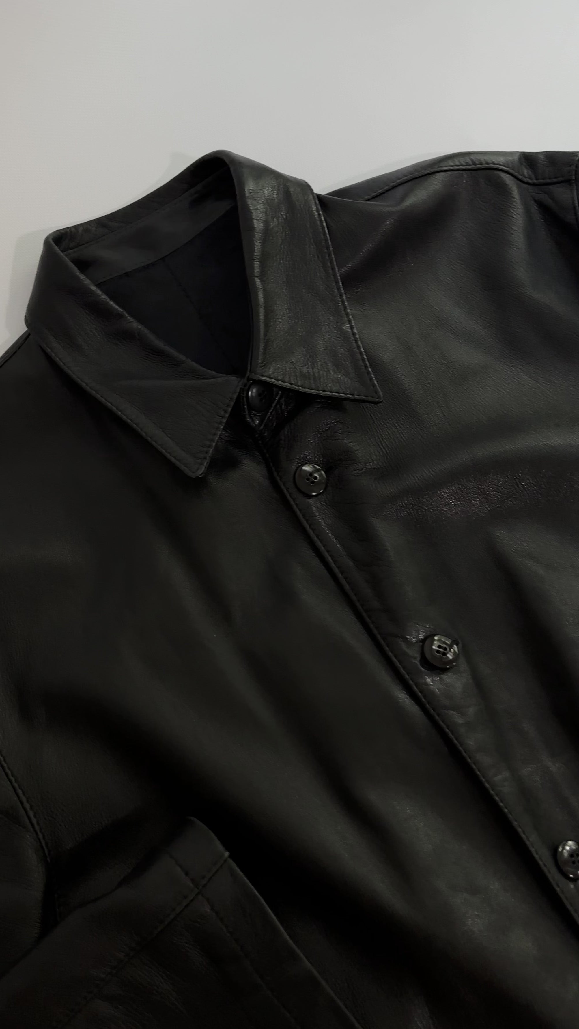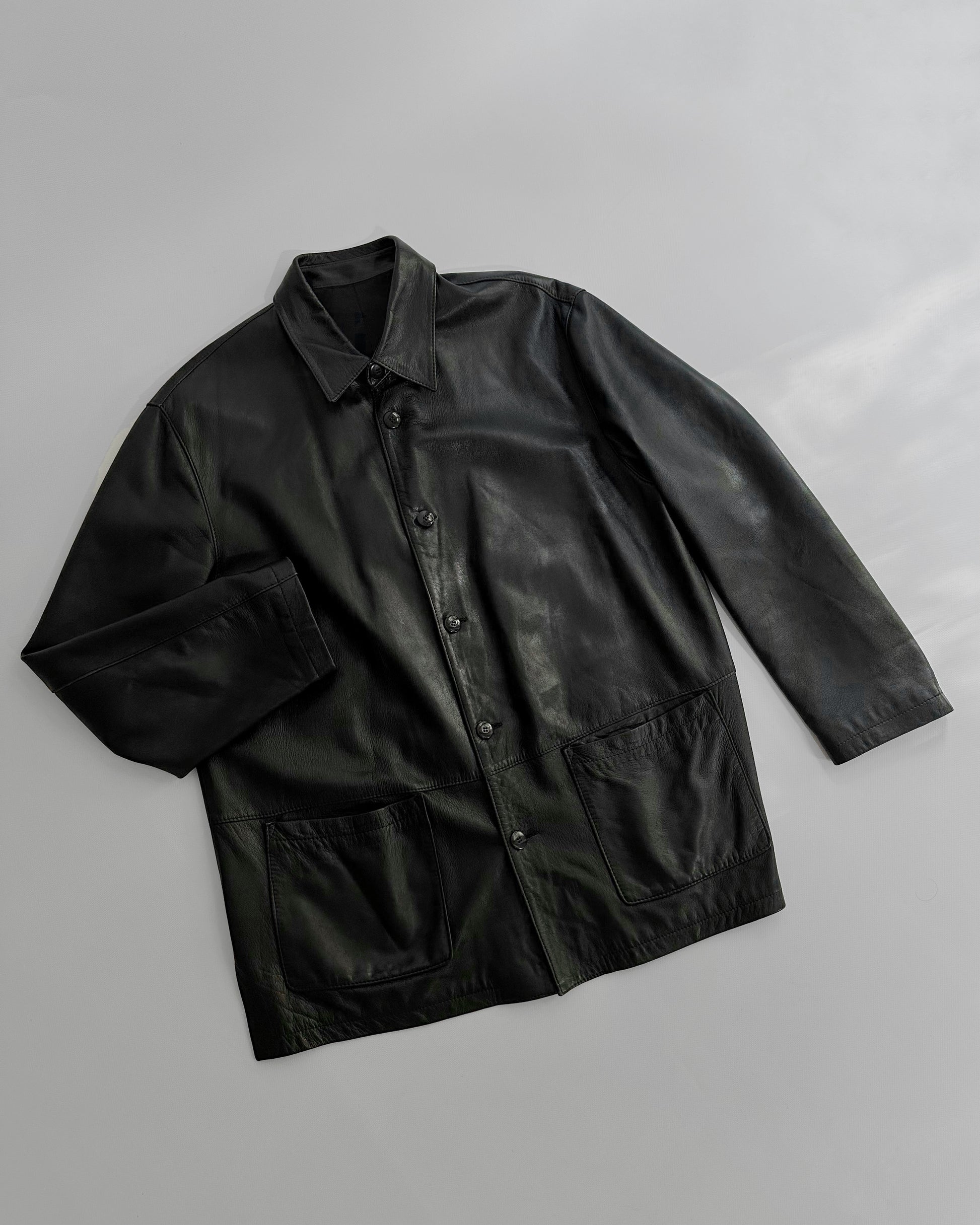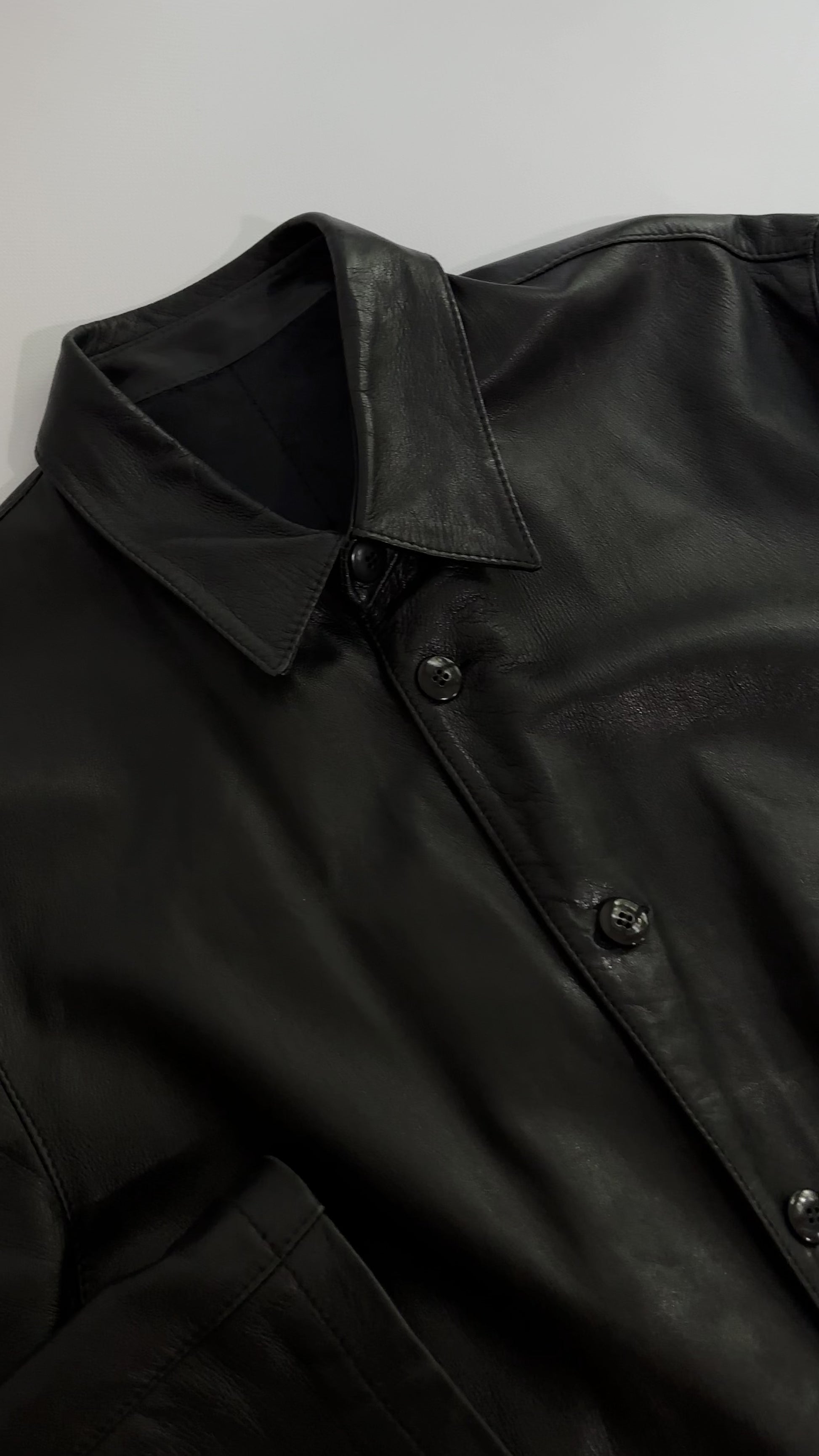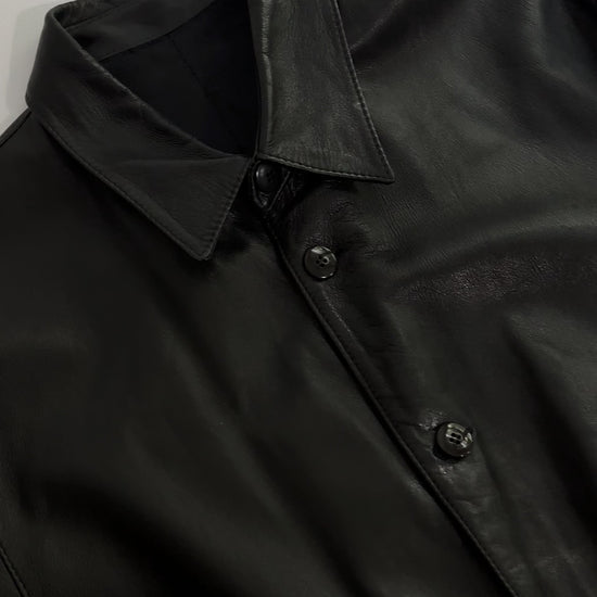 Vintage 1990s black nappa leather jacket with a soft, fluid hand and minimalist silhouette. Cut in a straight shirt style, it features a pointed collar, button-front closure, and two front patch pockets. Lightly structured yet supple, this timeless piece captures 90s understated design in extra soft leather.