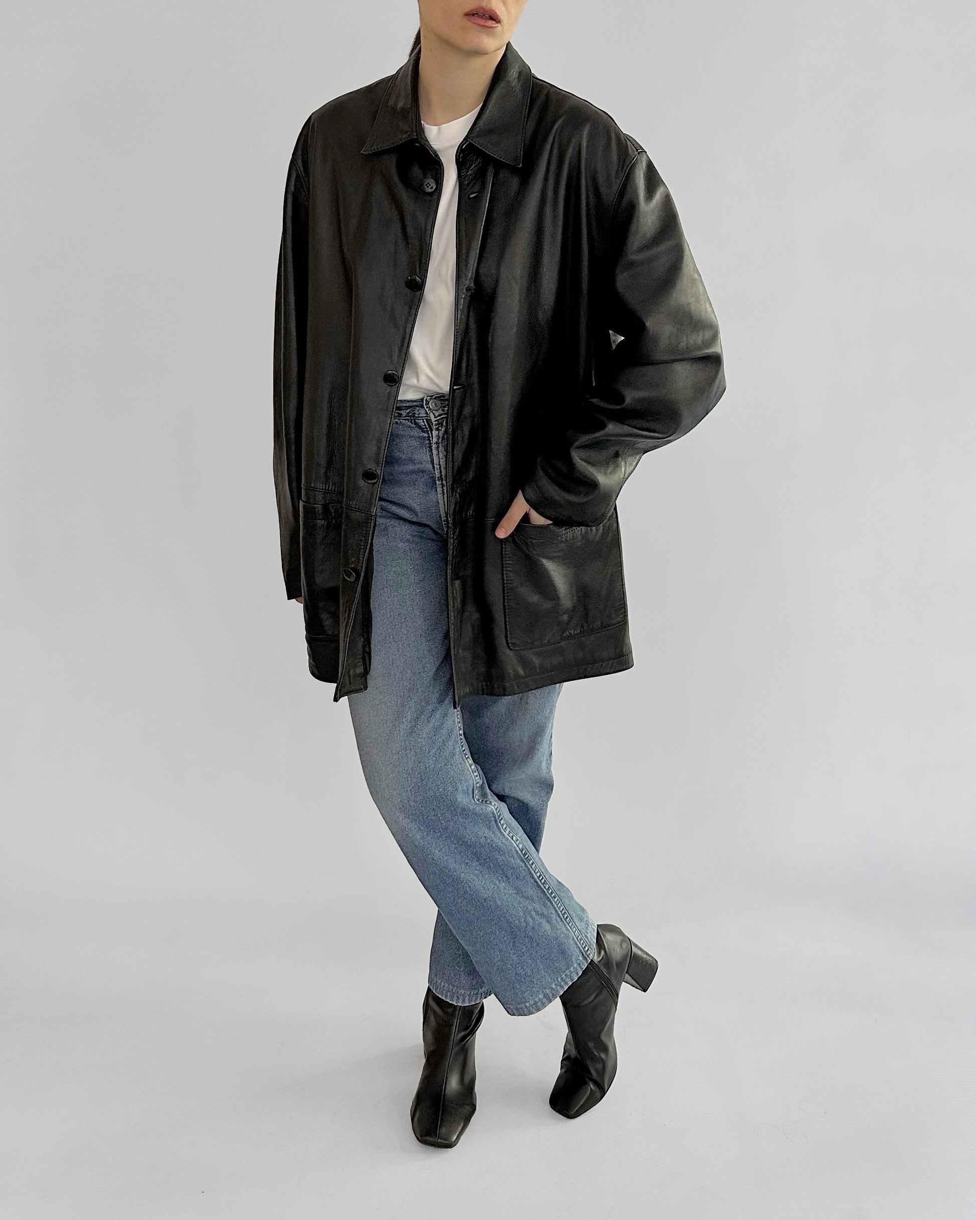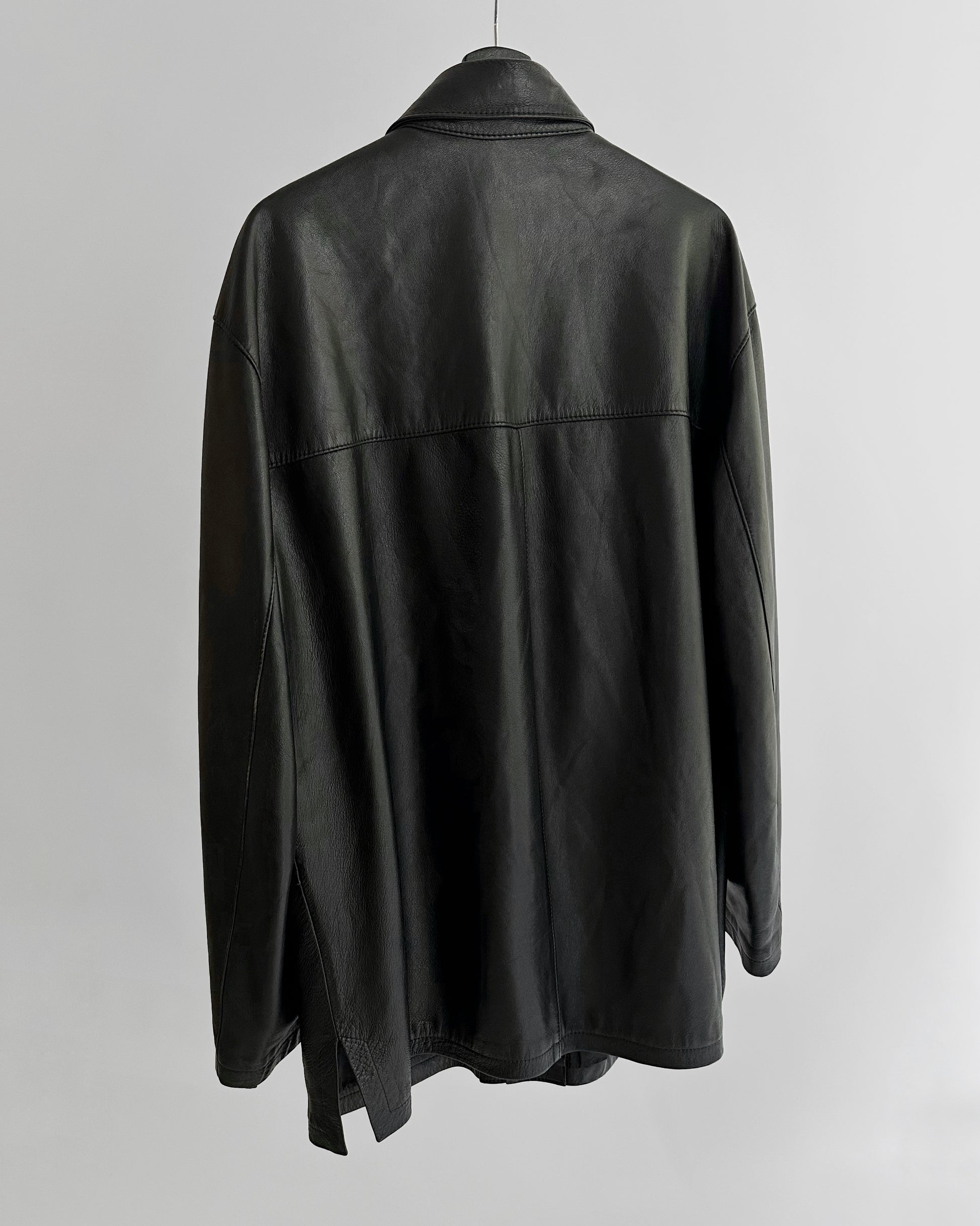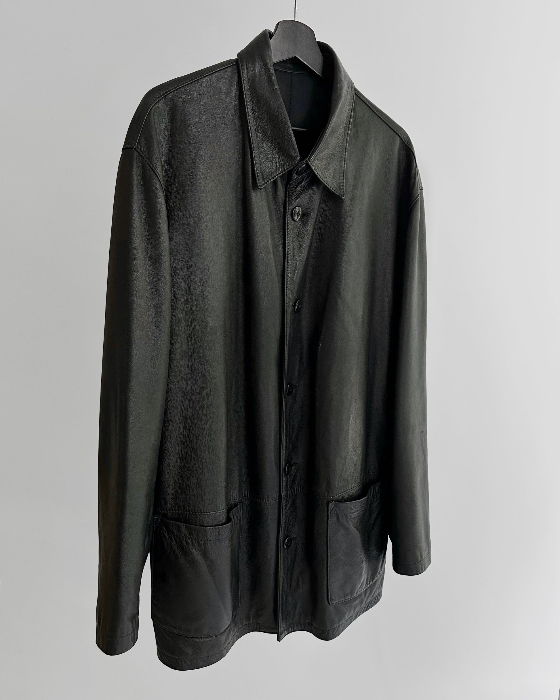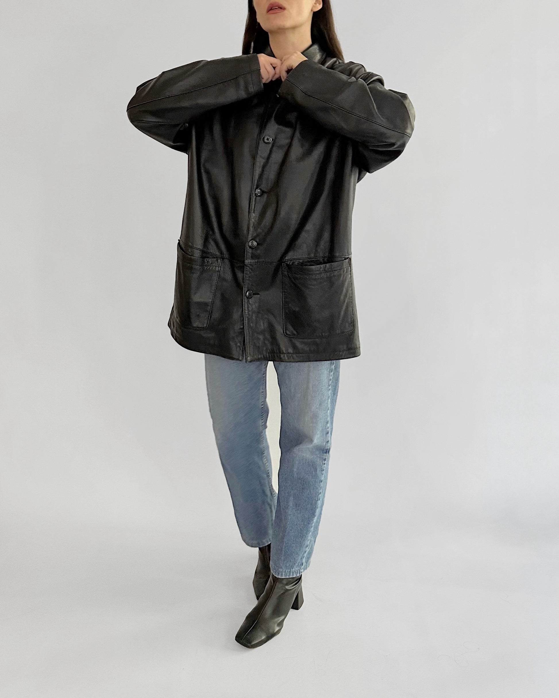 Vintage 1990s black nappa leather jacket with a soft, fluid hand and minimalist silhouette. Cut in a straight shirt style, it features a pointed collar, button-front closure, and two front patch pockets. Lightly structured yet supple, this timeless piece captures 90s understated design in extra soft leather.