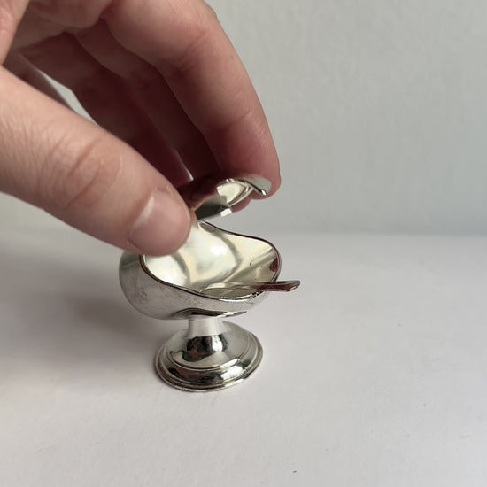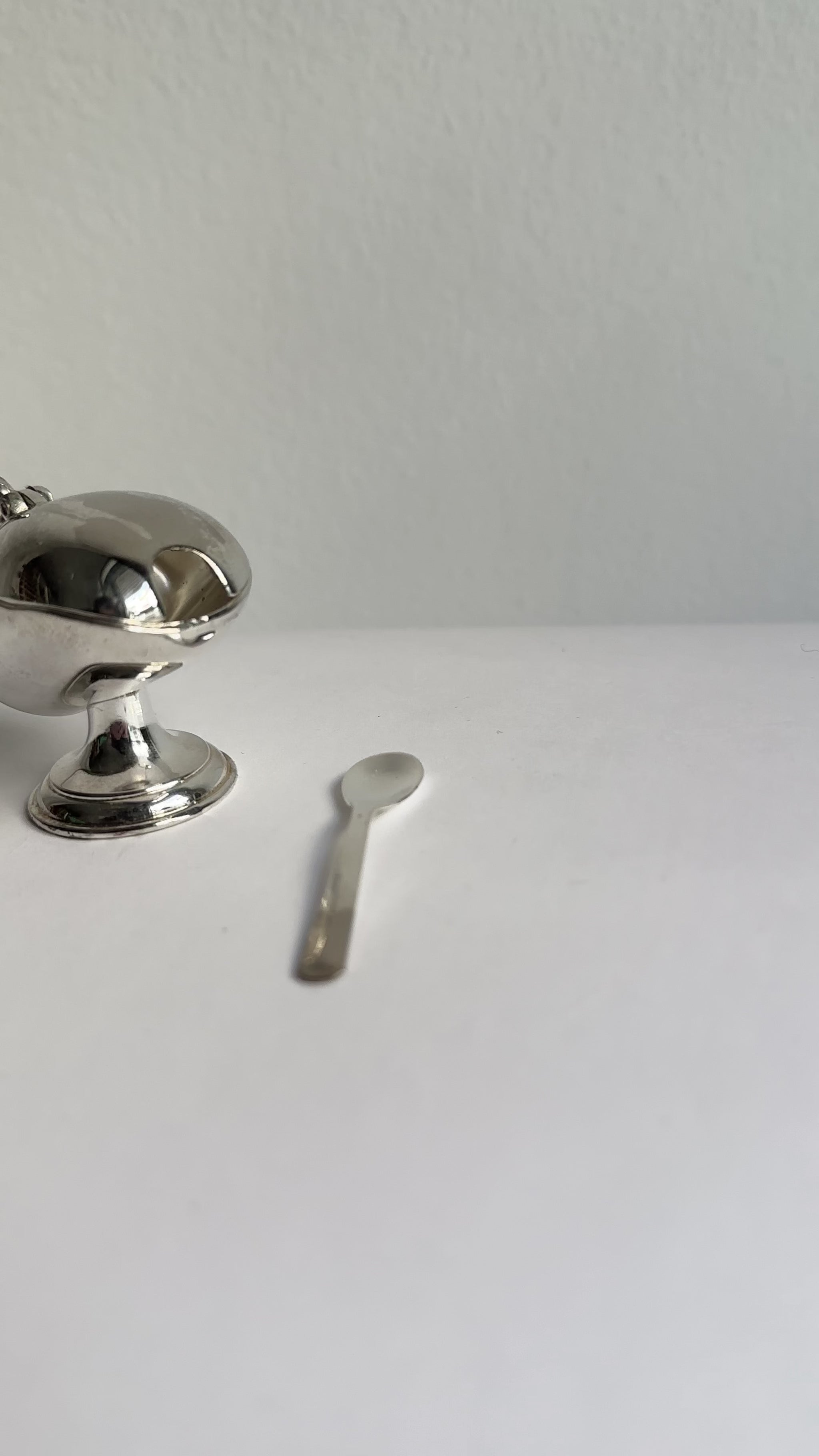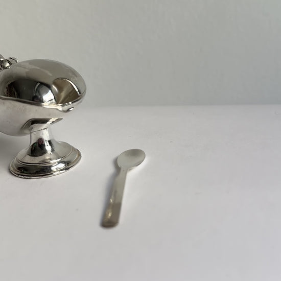 Vintage small metal saltcellar with matching teaspoon, likely dating to the 1950s. Designed with a rounded, lidded body set on a pedestal base, it features a sculptural silhouette with a hinged opening and integrated spoon rest. A refined mid-century table object, combining function and decorative appeal.