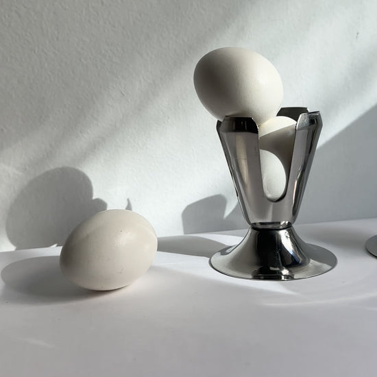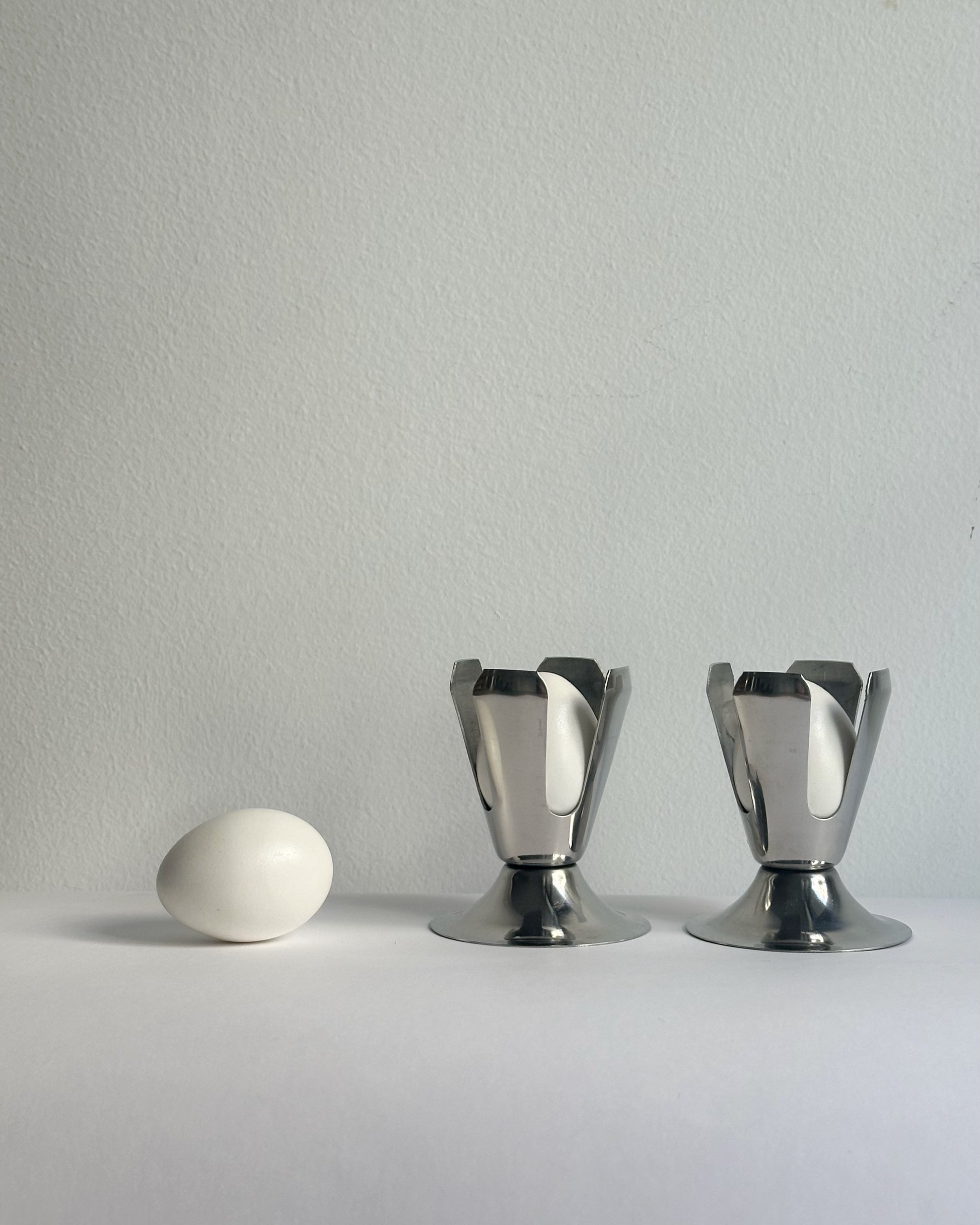 Vintage 1980s egg cups set of two with a sculptural, flared silhouette and a clean, minimalist design. They are crafted in stainless steel with a polished finish and a stable pedestal base. Compact and well-balanced, designed for everyday table use while also functioning as decorative objects.
